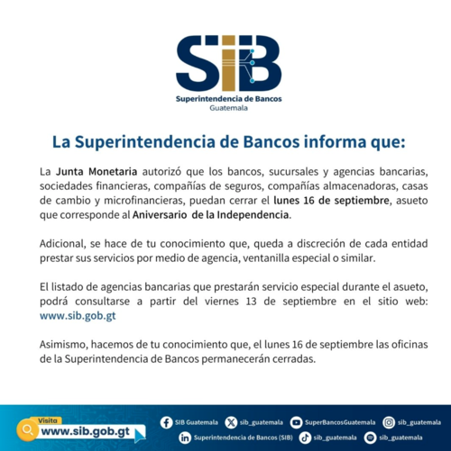 El jueves 12 de septiembre, la Superintendencia de Bancos (SIB) confirmó que los bancos, sucursales y agencias bancarias del país permanecerán cerrados este lunes 16 de septiembre, por motivo del asueto del Día de Independencia.