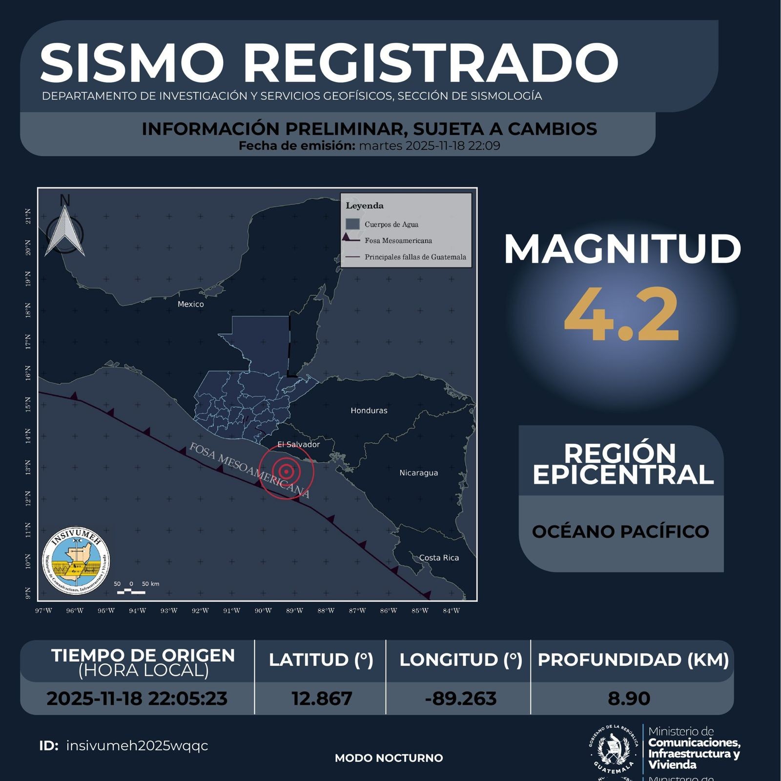 El sismo mencionado ocurrió a las 22:05 horas del 18 de noviembre, con una magnitud de 4.2 y epicentro tuvo lugar en el Océano Pacífico.