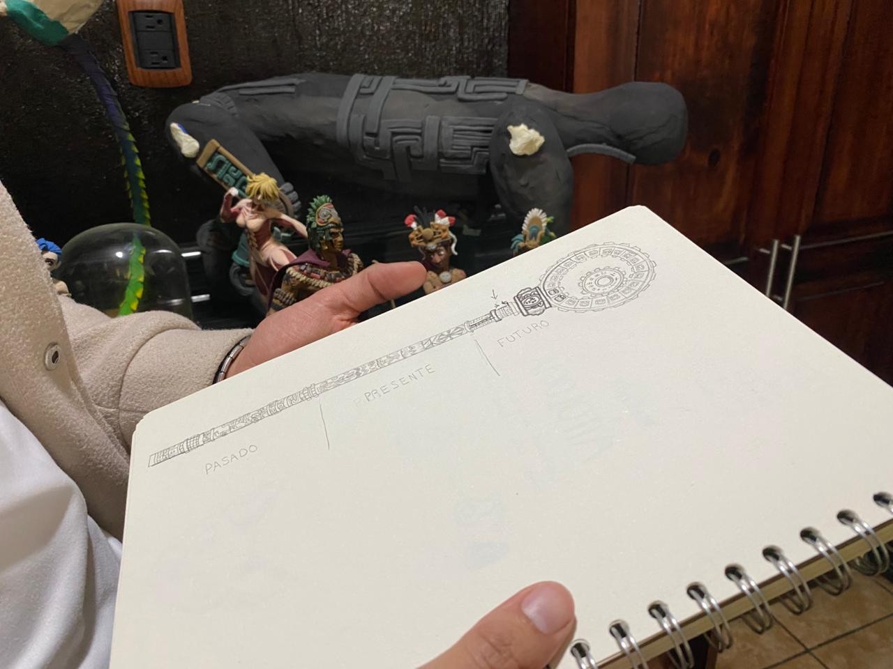 El pasado: tallado con detalles del periodo Clásico y Posclásico del imperio maya, además de dos mujeres elaborando su indumentaria, como aparece en la página 80 del Códice Maya de Madrid.