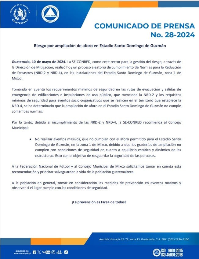 Previo al partido de ida de la final del torneo Clausura 2024, la Coordinadora Nacional para la Reducción de Desastres (Conred) recomendó la no utilización de los nuevos asientos instalados en el Estadio Santo Domingo de Guzmán, en el centro de Mixco, para el encuentro ante Municipal.