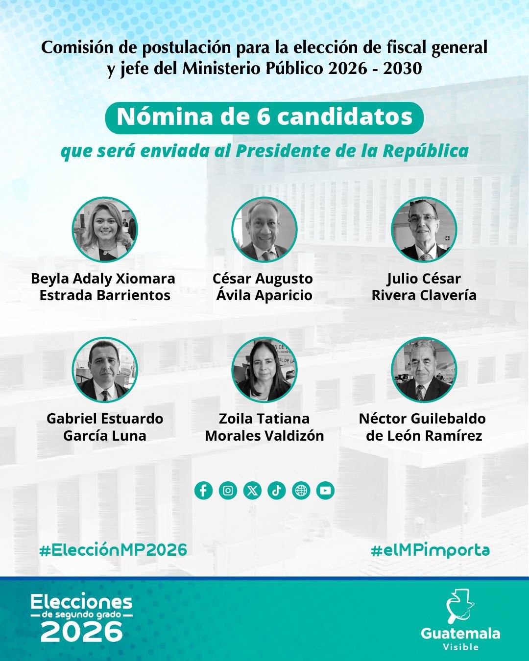 Los seis aspirante que obtuvieron el apoyo de 10 o más comisionados e integran la nómina final son: Beyla Adaly Xiomara Estrada de Brito, quien obtuvo 13 votos a favor y dos en contra; César Augusto Ávila Aparicio, 10 a favor y cinco adversos; Julio César Rivera Clavería, 11 a favor y cuatro en contra; Gabriel Estuardo García Luna, 10 a favor y cinco negativos; Zoila Tatiana Morales Valdizón, 10 a favor y cinco contrarios, y Néctor Guilebaldo de León Ramírez, 11 a favor y cuatro negativos.