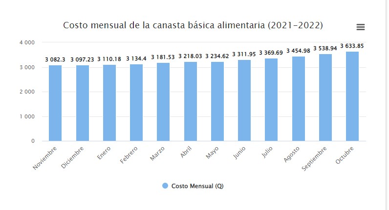 Según estadísticas del Instituto Nacional de Estadística (INE) en el último informe sobre costo mensual de la canasta básica alimentaria, la familia guatemalteca en promedio necesitó en octubre de 2022, Q3,633.85 para solventar la necesidad de comidas básicas.