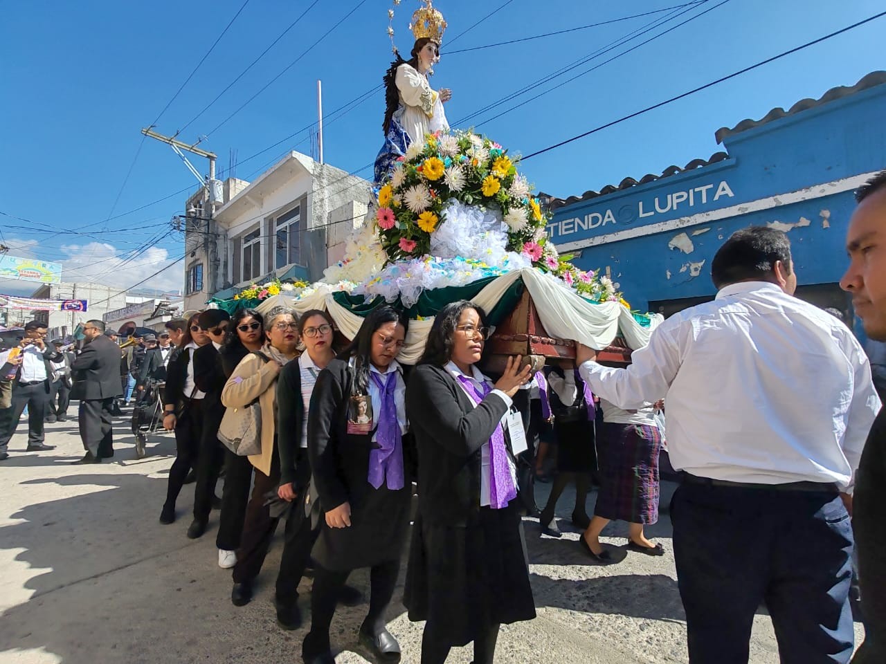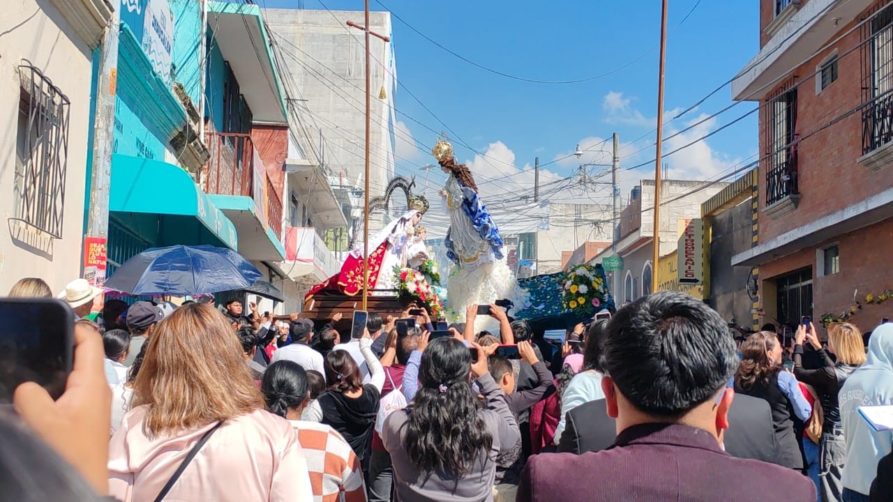 La venerada imagen de la Virgen de Candelaria, procedente de Chiantla, avanzó entre oraciones, incienso y música sacra hasta llegar al punto designado para el simbólico encuentro con la Inmaculada Concepción, que partió desde la Iglesia Catedral.