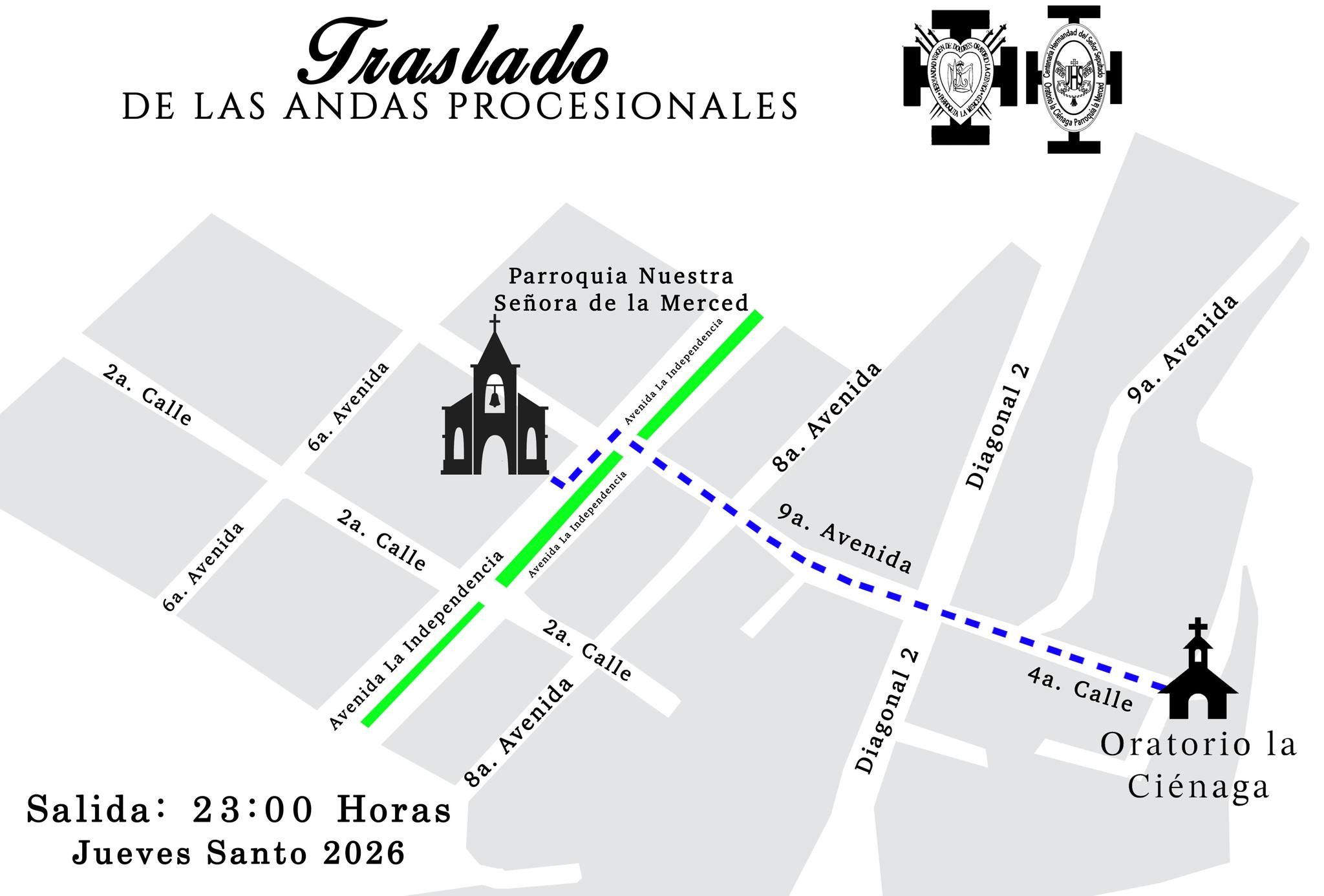 A partir de las las 20:30 horas se tiene previsto el traslado de andas procesionales desde distintos puntos a la Catedral de Los Altos y a la parroquia La Merced.