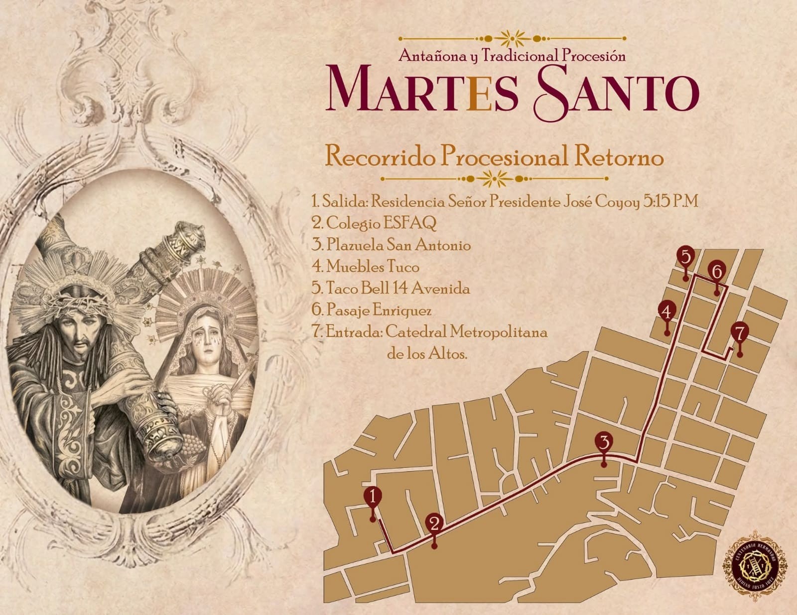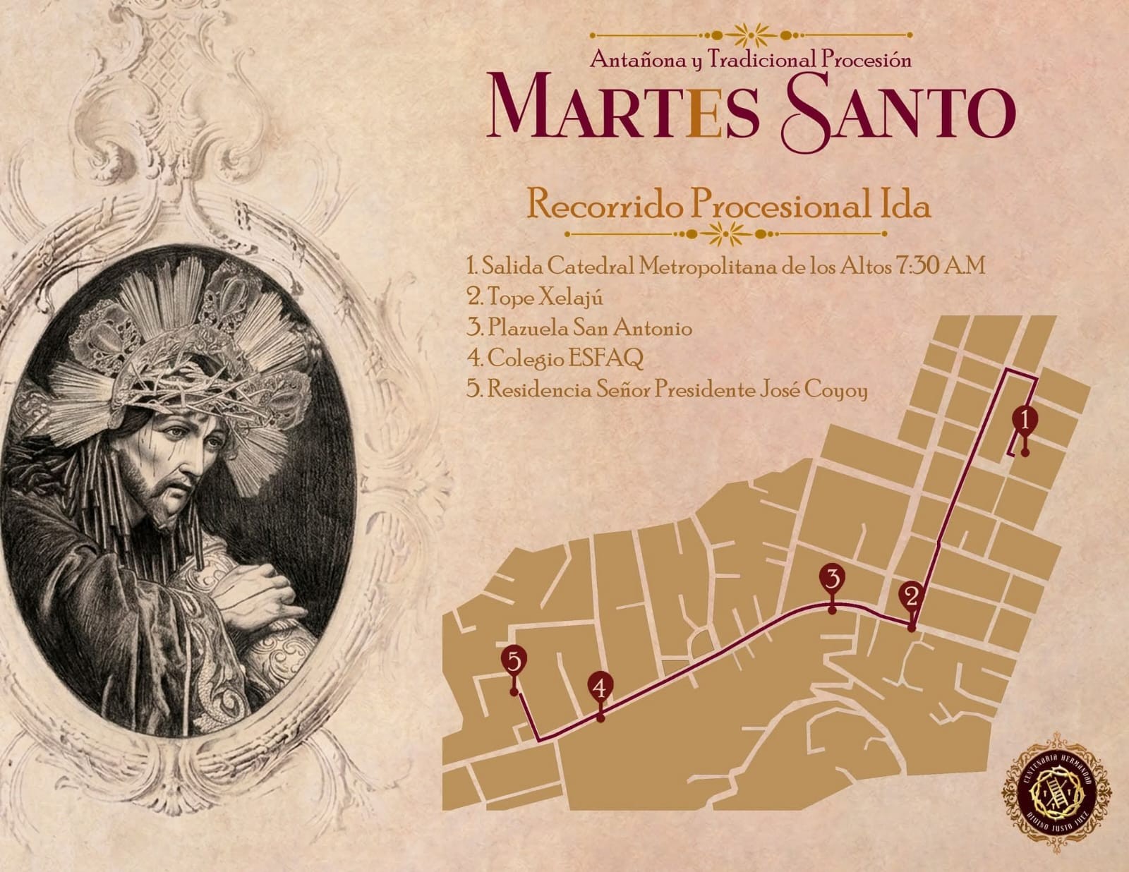Mientras que a partir de las 18 horas se desarrollará el cortejo procesional de Jesús de la Paciencia y Virgen de Dolores, el cual saldrá de la Catedral de Los Altos y culminará en la diagonal 11B, zona 1 altense, aproximadamente a las 23 horas.