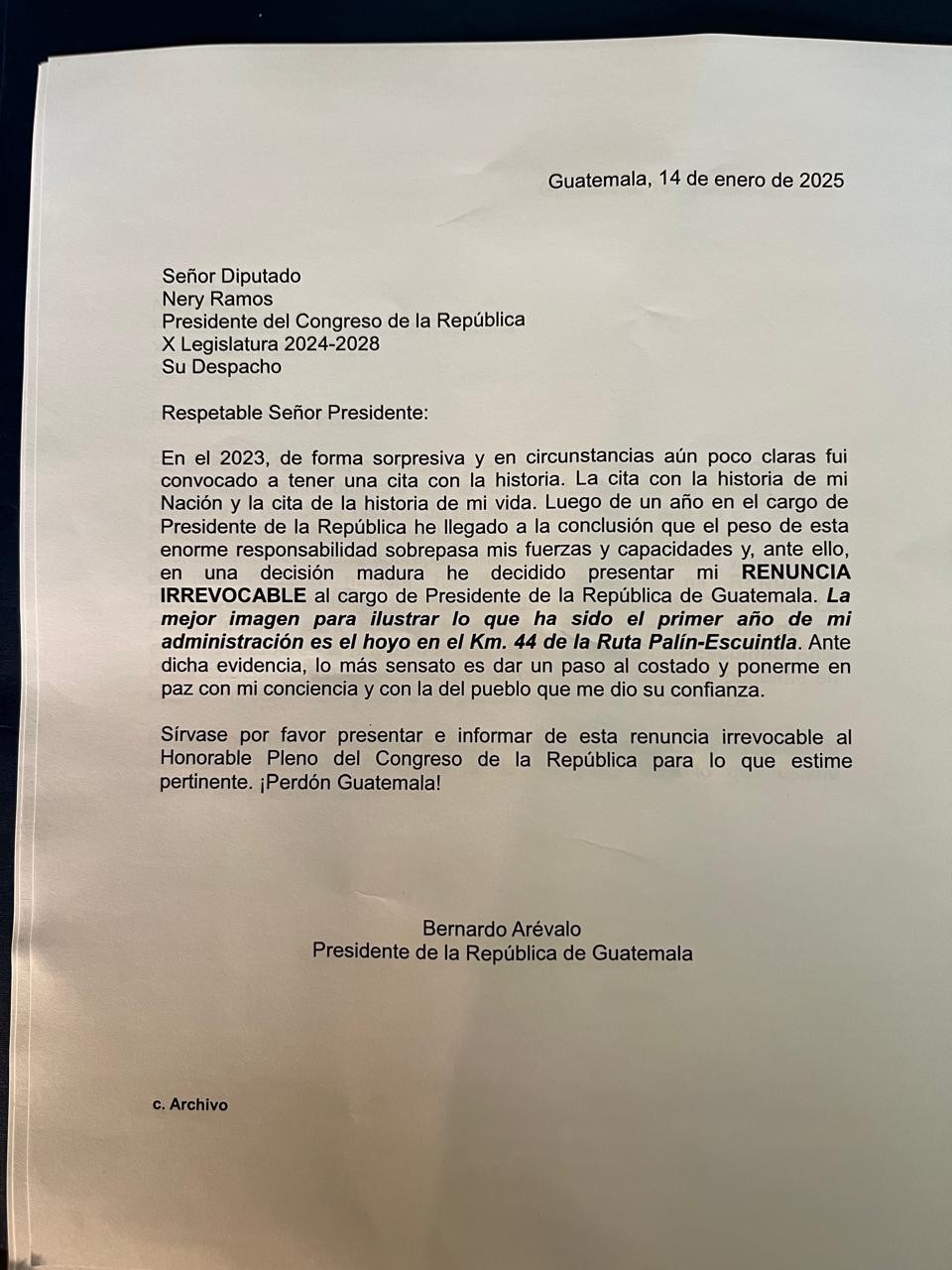 “En 2024 me permití enviarle (al presidente Arévalo) un borrador de carta de renuncia; aquí una versión actualizada... Por si la necesita en un momento de lo que puede ser el acto más heróico de su vida: Renunciar y pedirle perdón a Guatemala”, afirmó el congresista, quien agregó que “la mejor forma de ilustrar el fracaso del gobierno es el gran hoyo del kilómetro 44 de la Ruta Palin, Escuintla”.