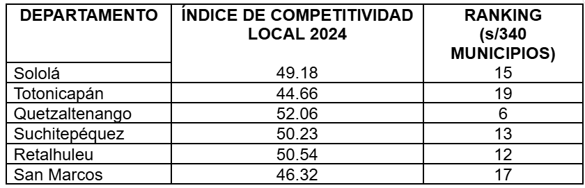Una mayor competitividad en el suroccidente guatemalteco puede transformar la región en un motor de crecimiento, reducir la desigualdad y mejorar la calidad de vida de sus habitantes. A continuación, la posición que ocupan los departamentos según el índice de Competitividad Local.