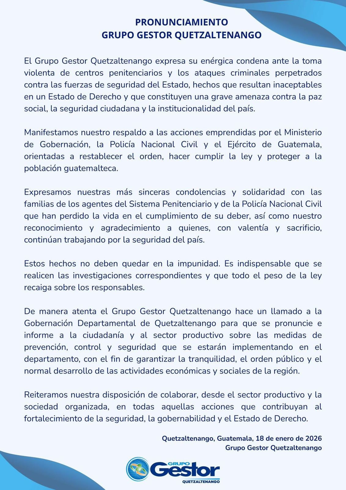 El Grupo Gestor de Quetzaltenango expresa su enérgica condena ante la toma violenta de centros penitenciarios y los ataques criminales perpetrados contra las fuerzas de seguridad del Estado, hechos que resultan inaceptables en un Estado de Derecho y que constituyen una grave amenaza para la paz social, la seguridad ciudadana y la institucionalidad del país.