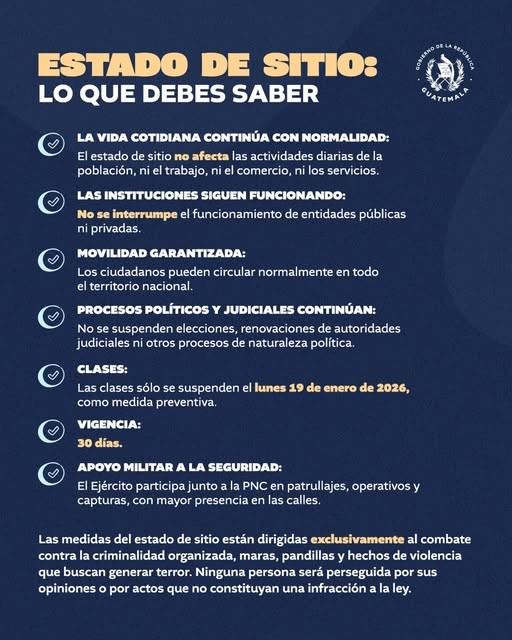 Es decir, que durante el estado de sitio la población continúa con su vida cotidiana normal, se trabaja, se estudia, hay comercios y servicios con normalidad. Tendrá una duración de 30 días y entra en vigor de manera inmediata.