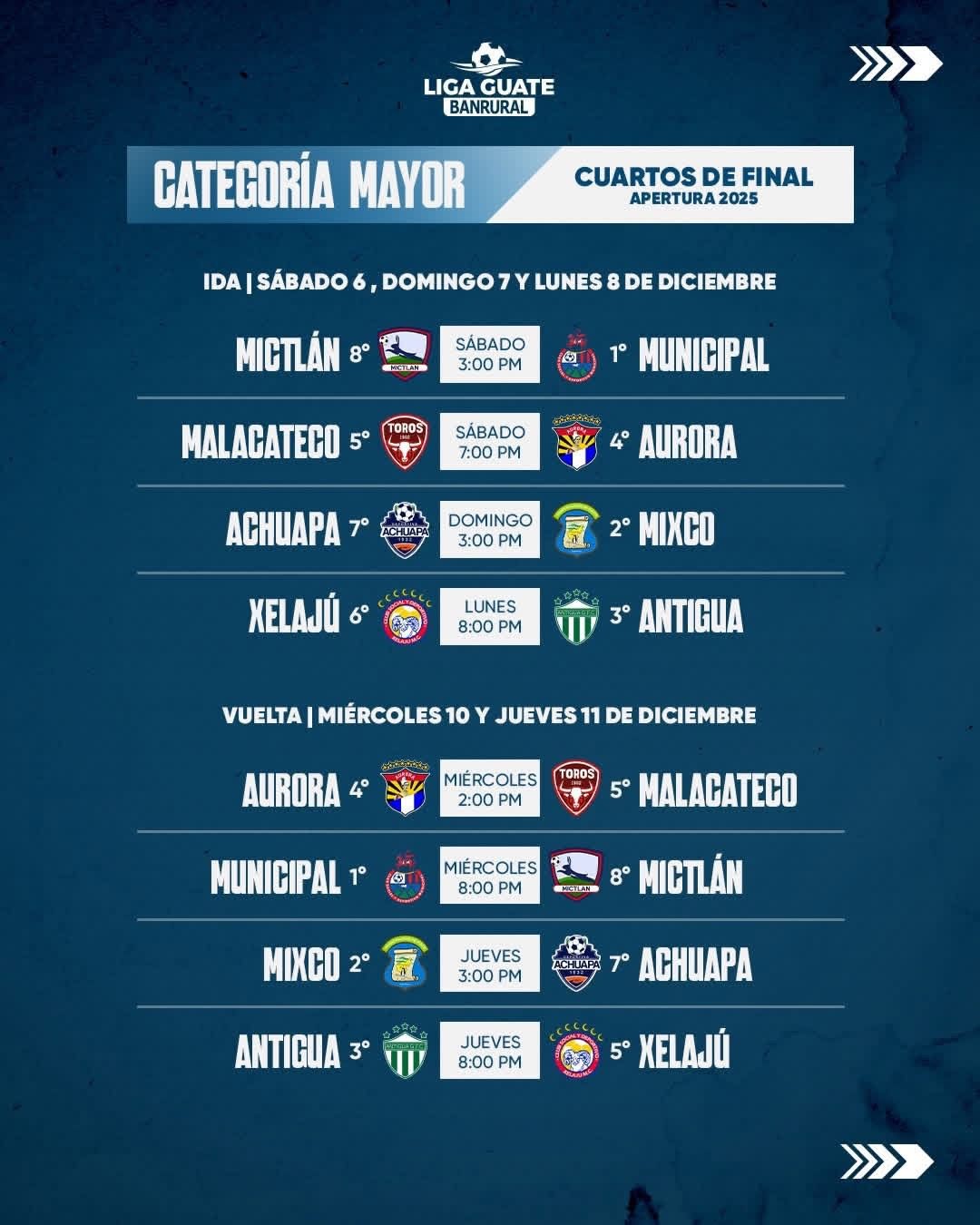 La otra serie arranca en Malacatán con el juego entre Malacateco y Club Aurora el sábado a las 19 horas en el estadio Santa Lucía. Mientras que la vuelta será el miércoles 10 a las 14 horas en el estadio Guillermo Slowing, de Amatitlán.