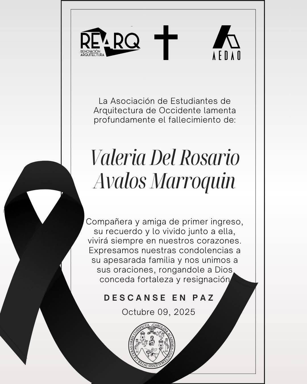 Valeria del Rosario Ávalos Marroquín, de 19 años, originaria de Mazatenango, es la víctima mortal del percance. Su muerte deja luto y dolor en su familia y en la comunidad del Centro Universitario de Occidente (Cunoc), principalmente en la Facultad de Arquitectura, que era la carrera que cursaba en esa casa de estudios como estudiante de primer ingreso.
