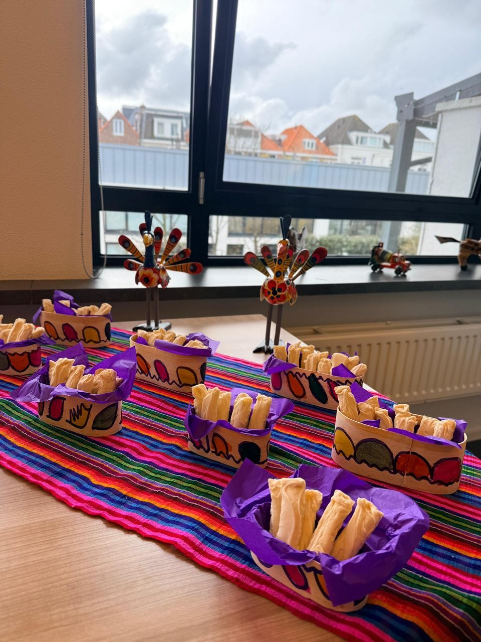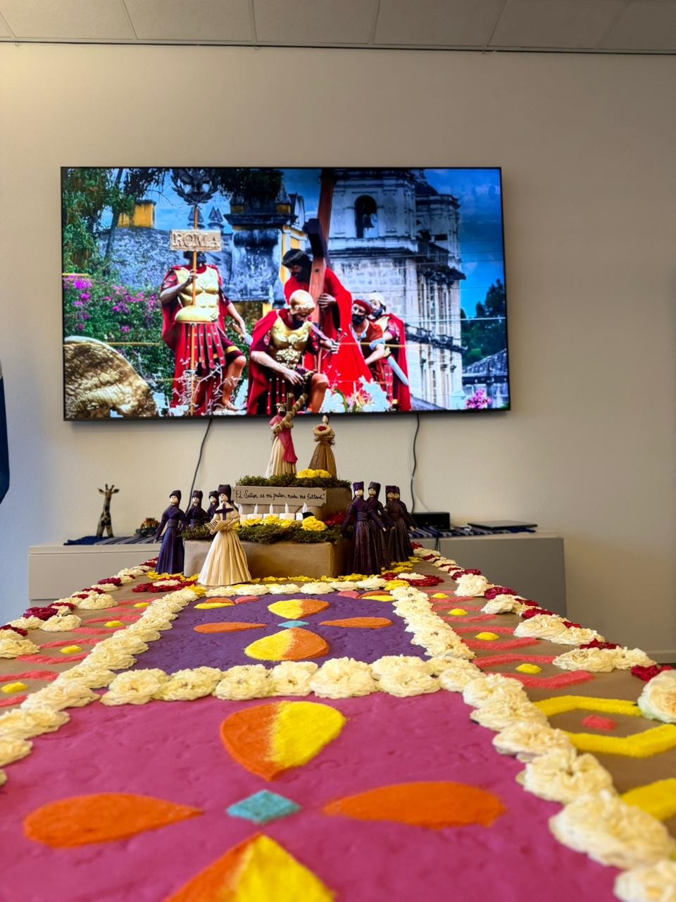 Para acercar al público a esta colorida tradición, la misión diplomática elaboró alfombras con rosas donadas por HPD Potplanten y diseños de colores vibrantes. Asimismo, se presentó una miniatura de procesión con muñecas de tusa provenientes de Uaxactún, Petén.