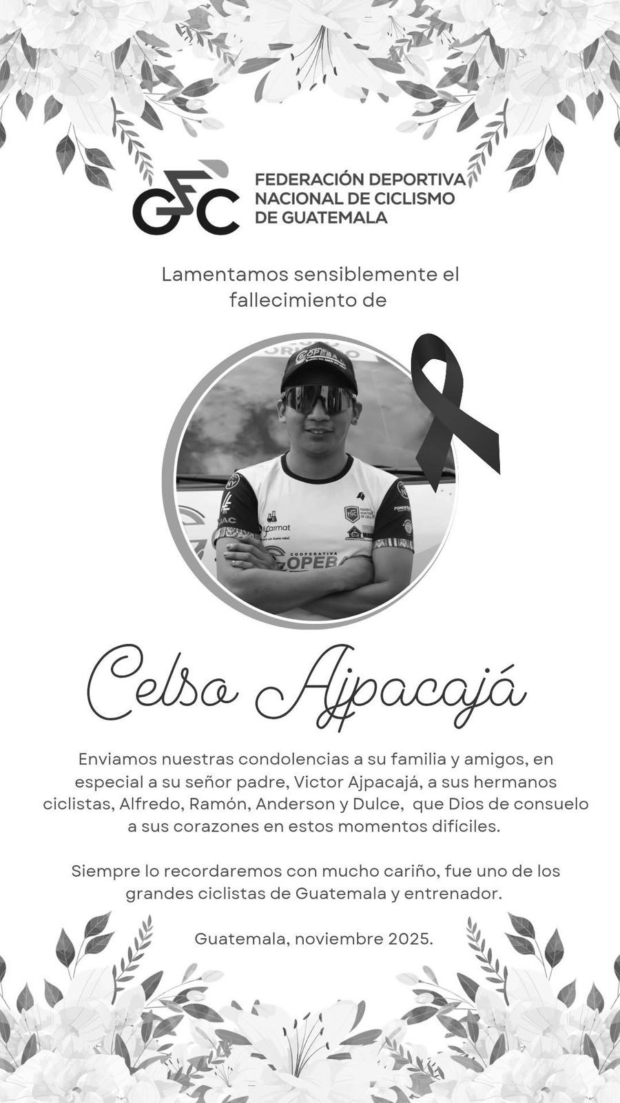 El mundo del ciclismo guatemalteco lamenta profundamente su partida y envía muestras de solidaridad a su familia y seres queridos.