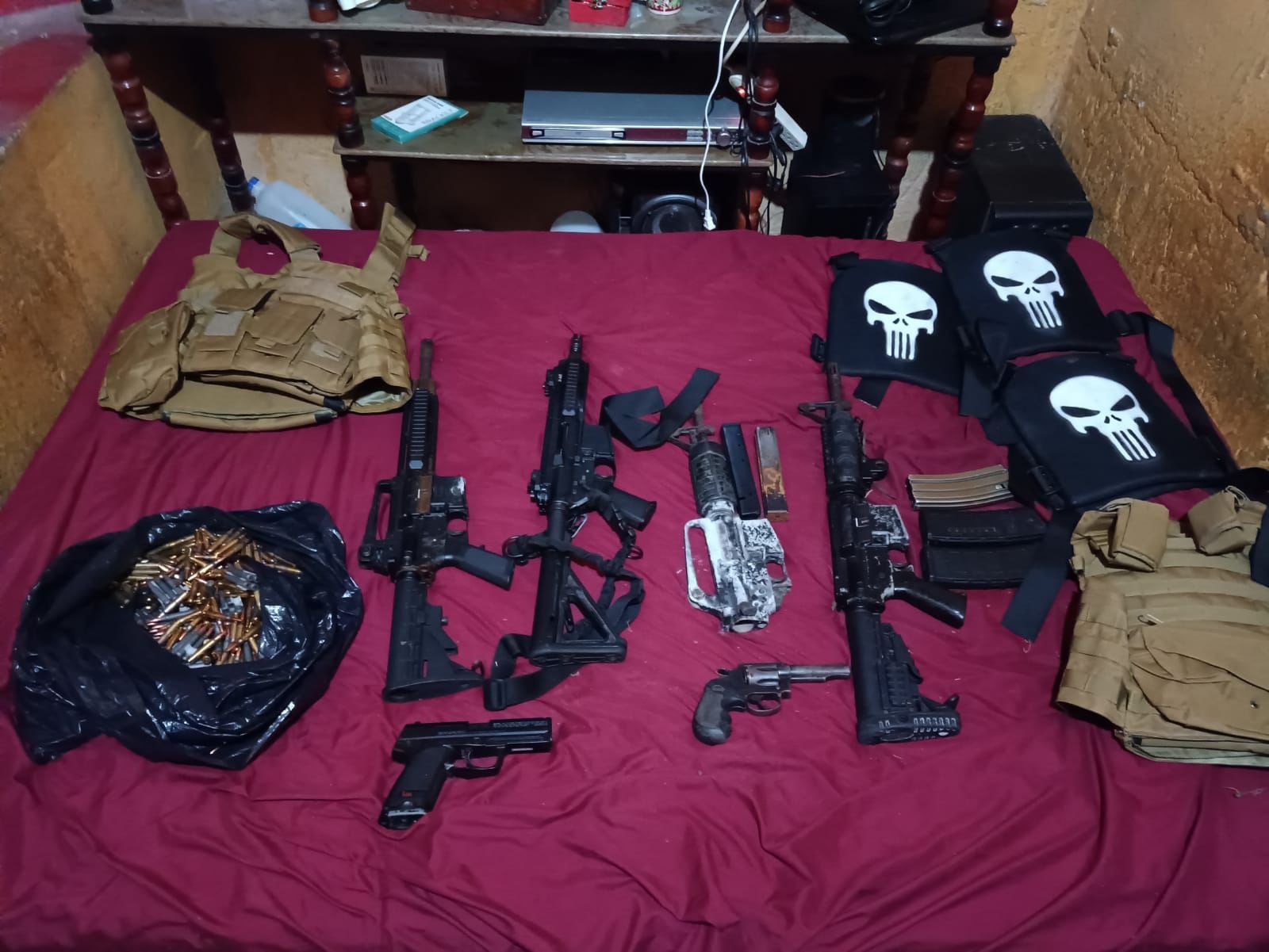 Además, los allanamientos realizados en la colonia Landívar, zona 7; zona 19; Chinautla y Santa Catarina Pinula, permitieron el decomiso de armas de fuego, entre ellas, fusiles, así como municiones, chalecos antibalas, droga y dinero. A eso se suma que en uno de los inmuebles inspeccionados se encontró un altar a la “Santa Muerte”.