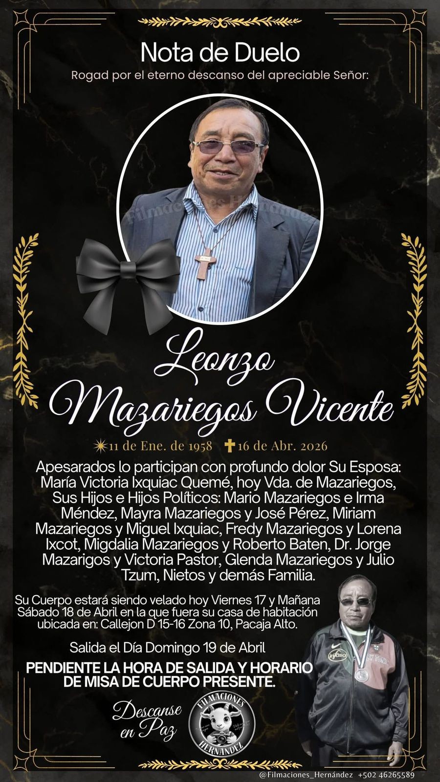 La víctima fue identificada como Leoncio Mazariegos, originario de la zona 10 de la cabecera departamental. Mazariegos fue auxiliado por los Bomberos Voluntarios de la Estación de Apoyo Campo Escuela, quienes lo trasladaron de urgencia al Hospital Regional de Occidente (HRO) con varias heridas y un hematoma severo en el cráneo. La víctima falleció a su ingreso al centro asistencial debido a la gravedad de las lesiones.