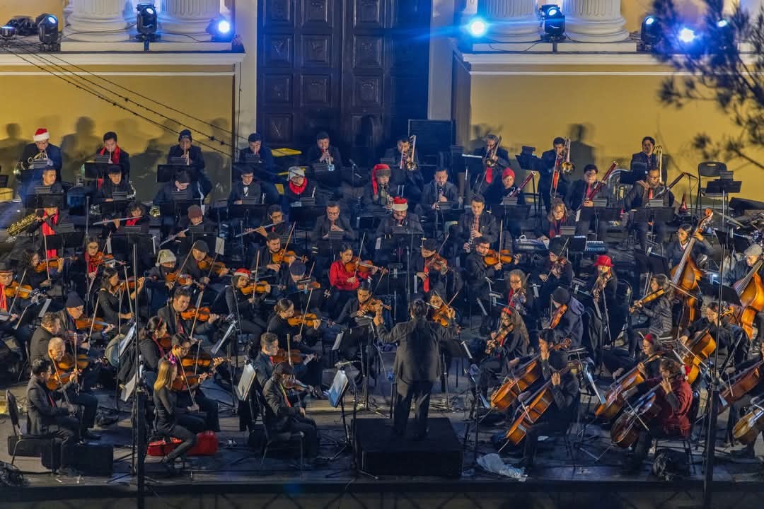 La Orquesta Sinfónica Nacional continúa con su gira departamental, compartiendo música y alegría en noches frías. Esta semana, frente al atrio de la Catedral de Huehuetenango, ofreció un concierto con piezas de música clásica y navideña para las familias.