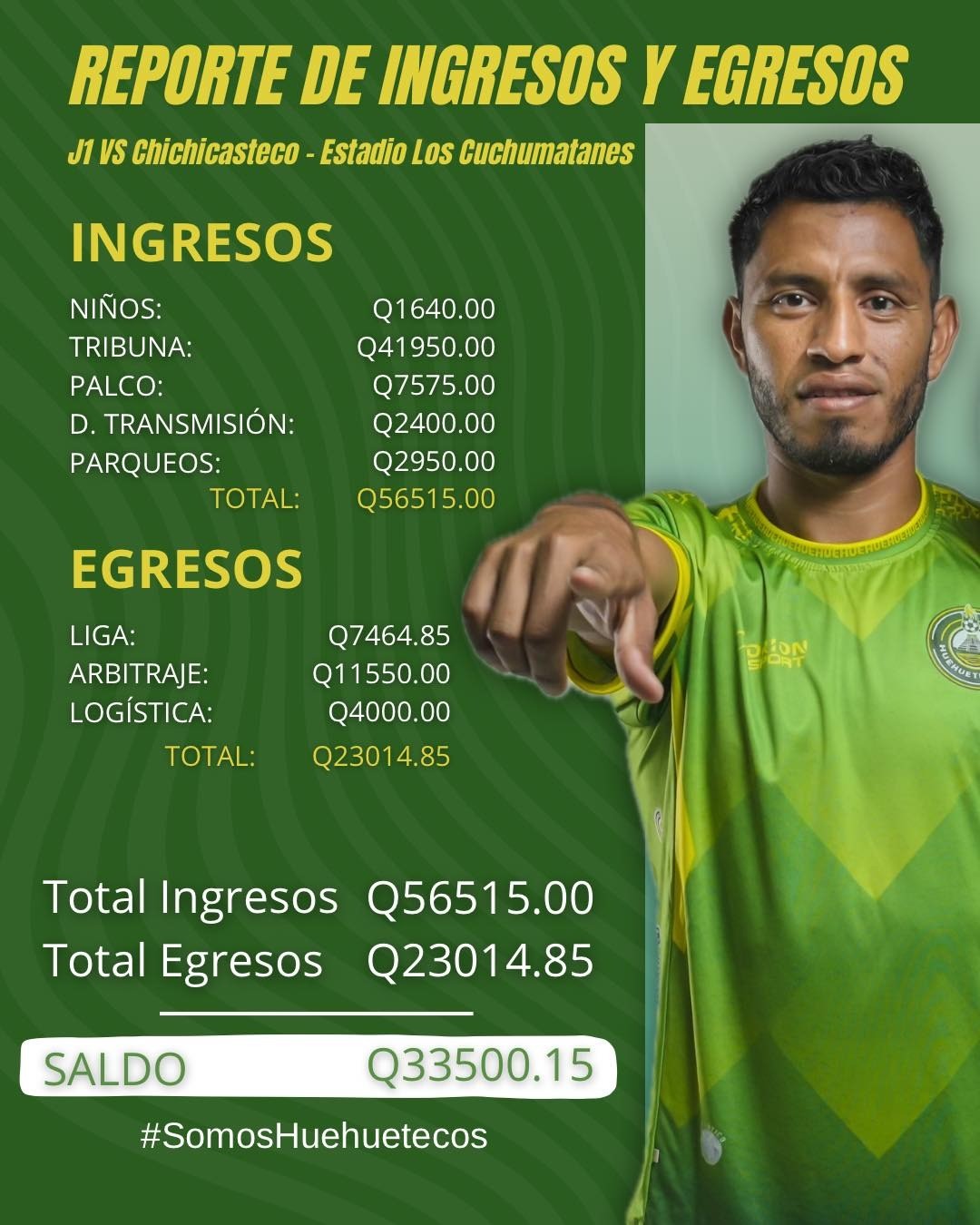 En los egresos, el club detalló los pagos realizados a la Liga, arbitraje y gastos logísticos del evento, tras cubrir estos compromisos, Huehuetecos FC cerró la jornada con un saldo positivo de Q33,500.15, resultado que la dirigencia calificó como alentador para la estabilidad del proyecto deportivo.