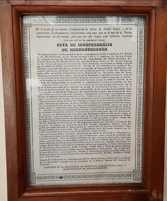 El 15 de septiembre de 1821 Guatemala se había independizado de España, sin embargo en Huehuetenango se desconocía porque las noticias tardaban el llegar, por lo que los huehuetecos decidieron proclamar su propia independencia.