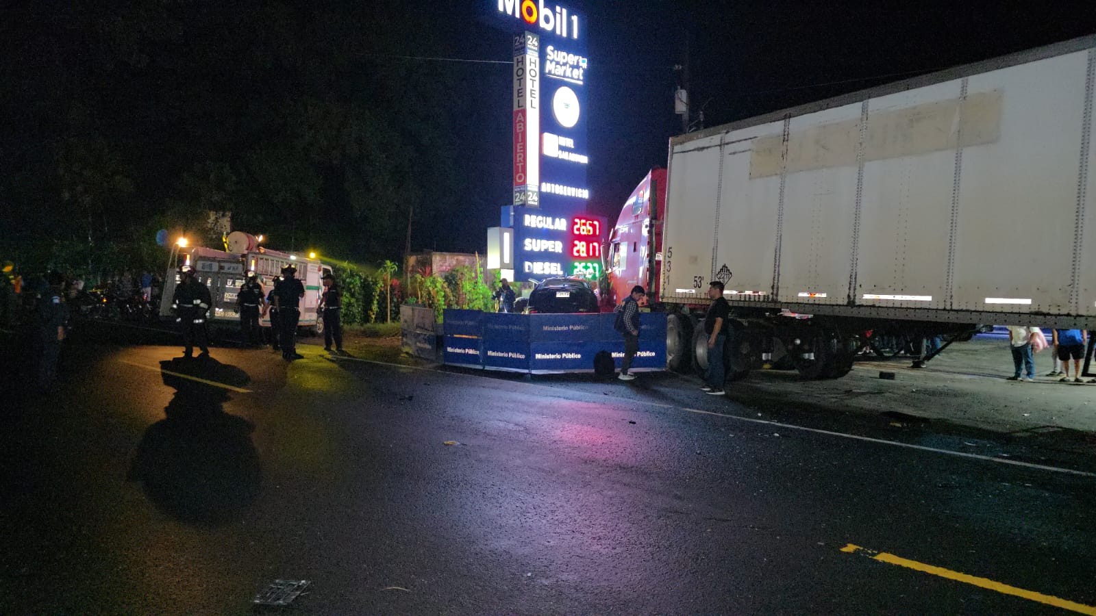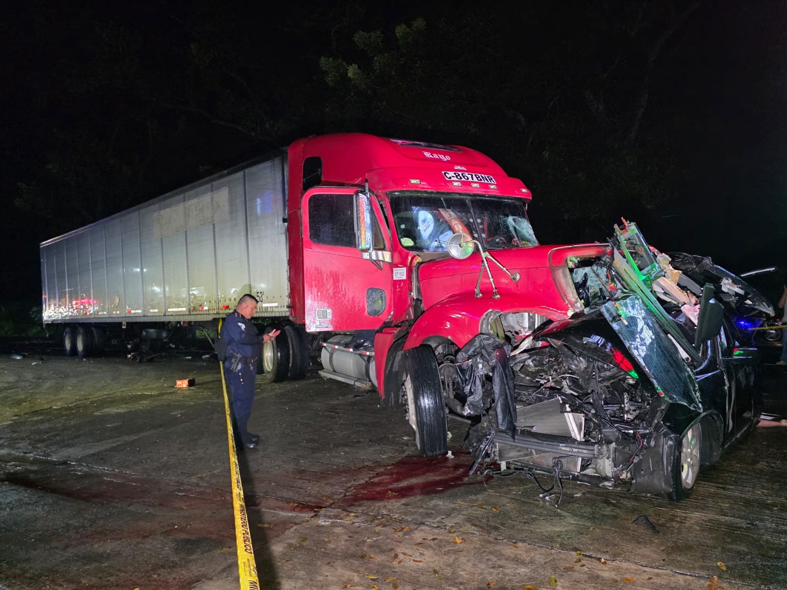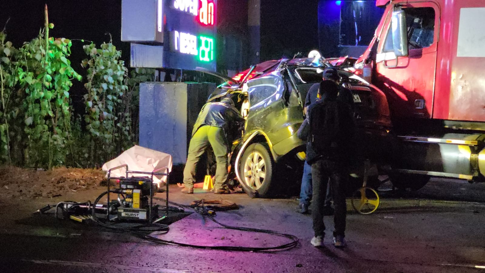 Imágenes captadas por una cámara de seguridad muestran el momento en que el vehículo derrapa, presuntamente debido a las lluvias registradas esa tarde, impactando de frente contra un tráiler.