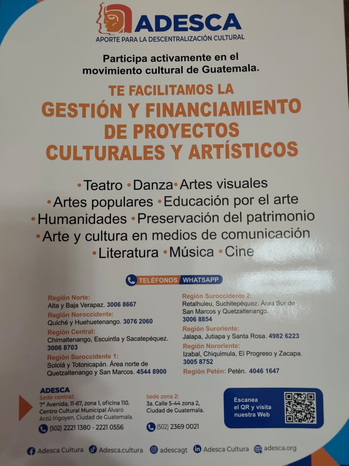 La Asociación para el Desarrollo Cultural (ADESCA) promueve la participación ciudadana en el fortalecimiento del arte y la cultura en Guatemala, facilitando la gestión y financiamiento de proyectos culturales y artísticos en distintas disciplinas.