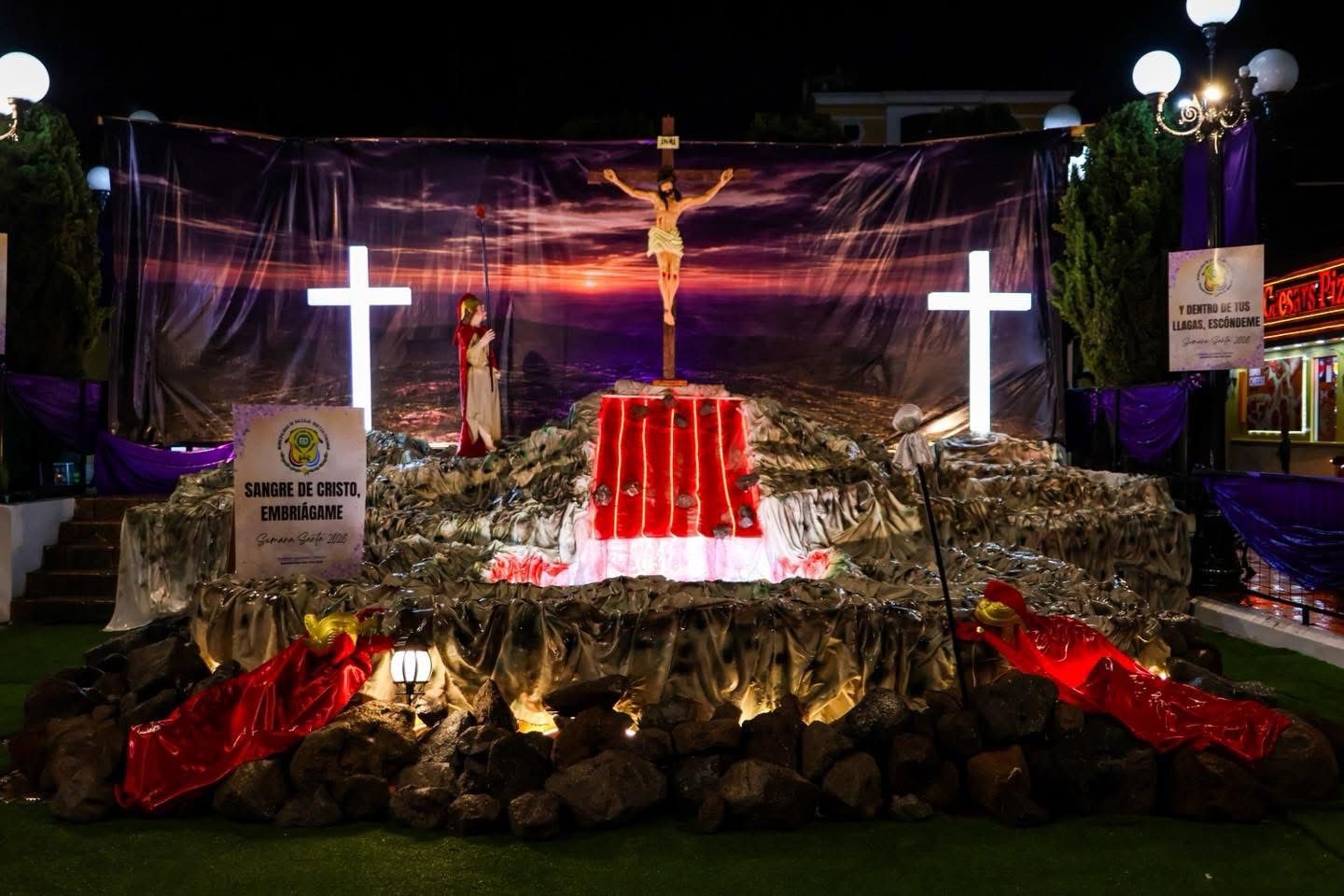 Las autoridades Municipales llevó a cabo la bendición del adorno alusivo a la Semana Santa 2026 en el Parque San Luis, Salcajá, Quetzaltenango. una obra elaborada por colaboradores municipales, inspirada en la jaculatoria de la Sangre de Cristo.