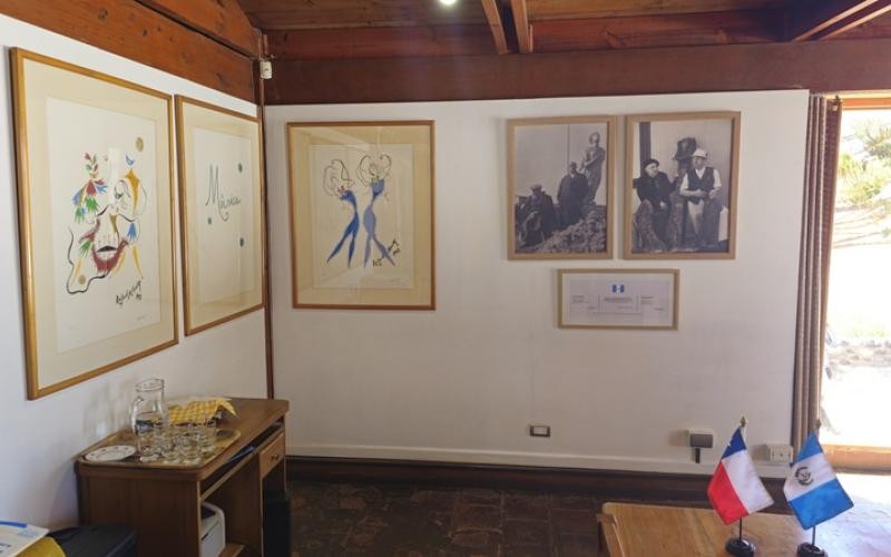 El espacio incluye dos fotografías de ambos escritores en Isla Negra y un pergamino con versos de “Oda a Guatemala” y “Pablo Neruda Vivo”.