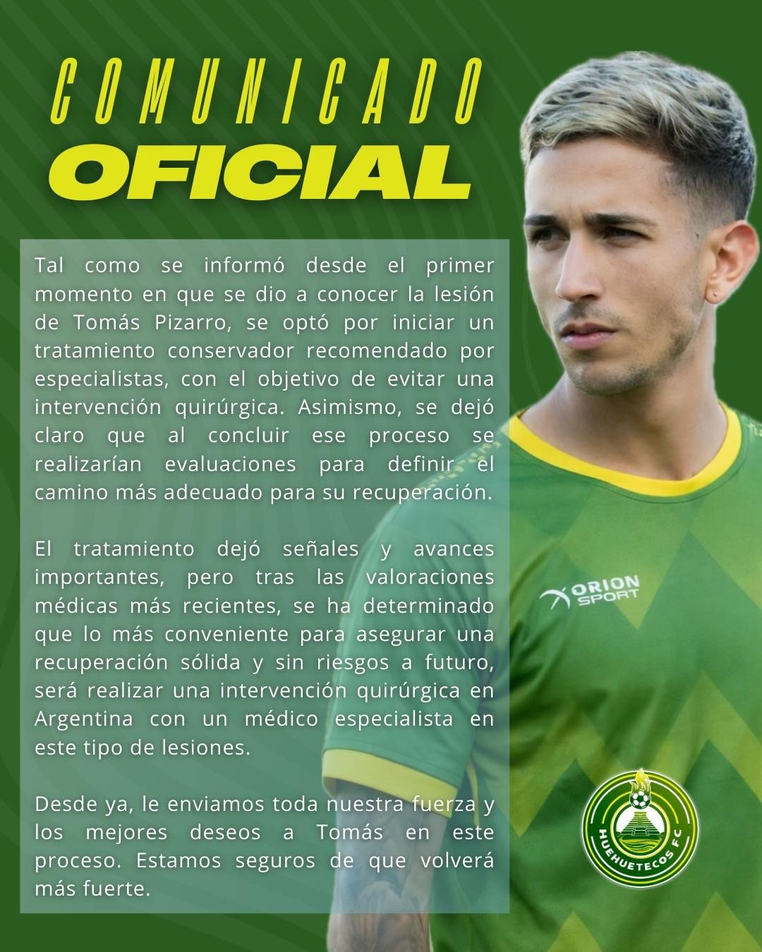 El club Huehuetecos FC informó que el jugador Tomás Pizarro será sometido a una intervención quirúrgica en Argentina, como parte del proceso para atender la lesión que lo ha mantenido alejado de la actividad competitiva en las últimas semanas.