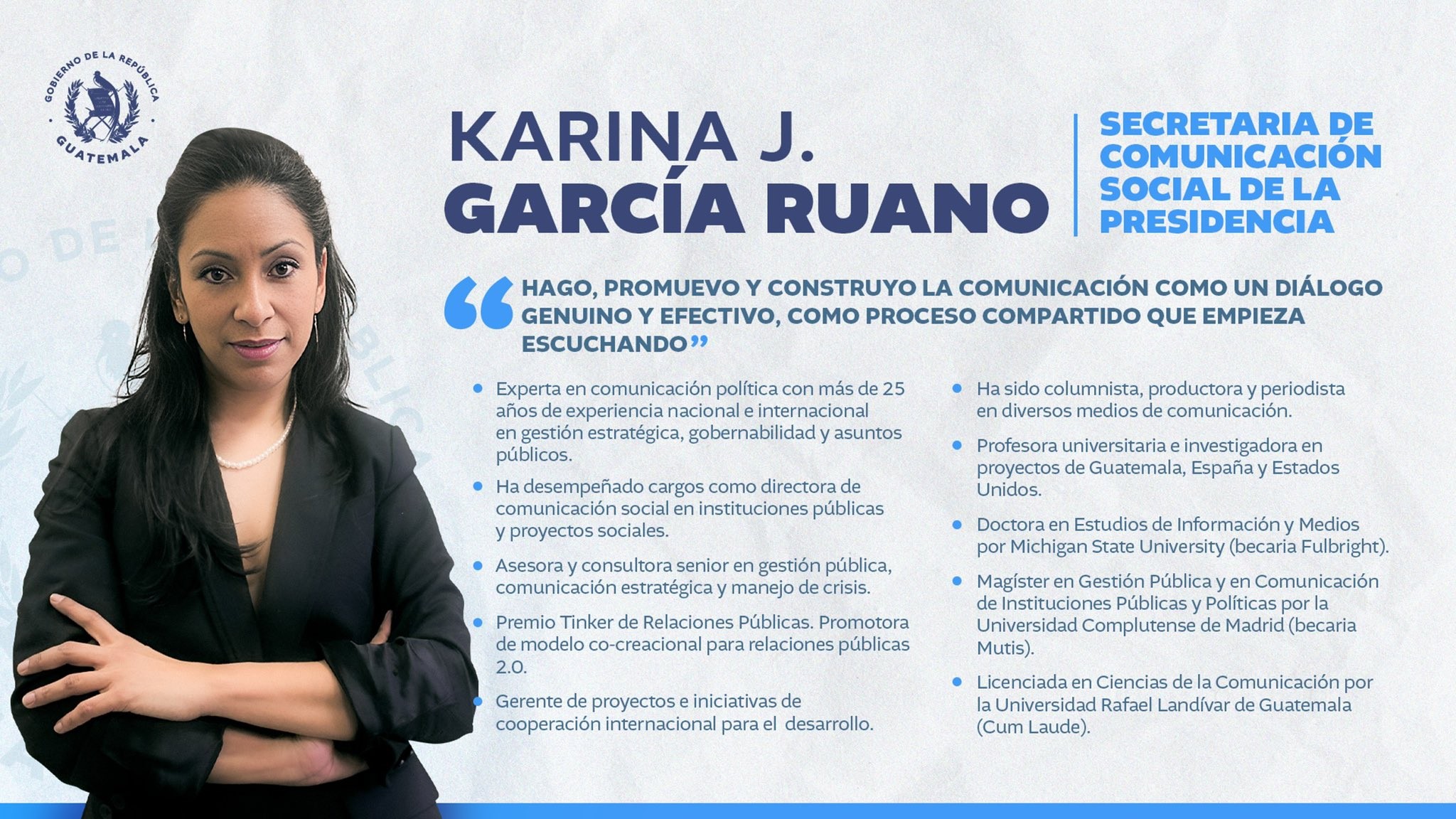 La doctora Karina García Ruano fue juramentada este lunes como Secretaria de Comunicación Social de la Presidencia, en sustitución del licenciado Santiago Palomo, quien asumirá el cargo de Embajador de Guatemala ante el Vaticano. El acto oficial marcó un nuevo rumbo para la estrategia comunicativa del Gobierno en un contexto de retos informativos.
