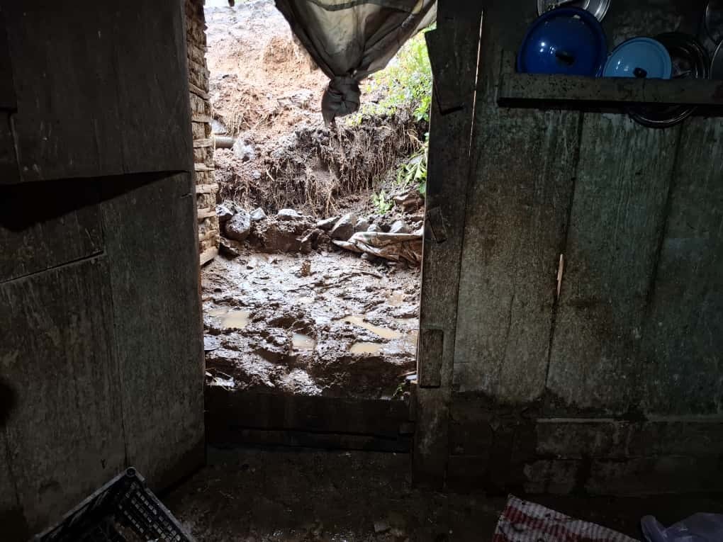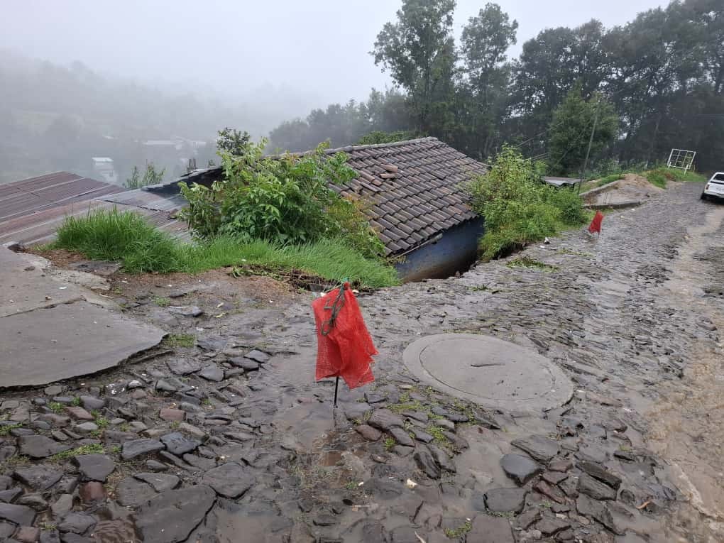 Las intensas lluvias de los últimos días provocaron que parte de una calle colapsara sobre una vivienda en la aldea La Grandeza, San Pedro Sacatepéquez, San Marcos.