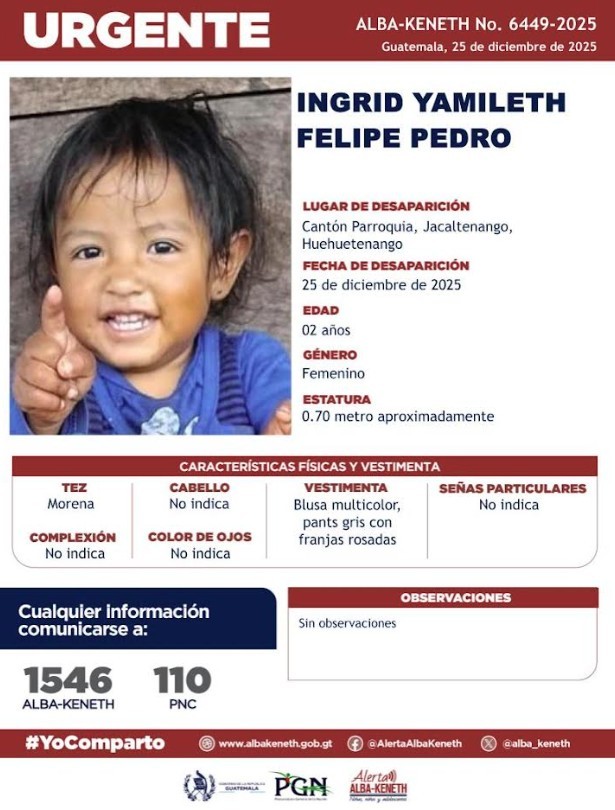 Una niña de 3 años que había sido reportada como desaparecida fue localizada con vida tras más de 30 horas de búsqueda en el municipio de Jacaltenango, Huehuetenango.