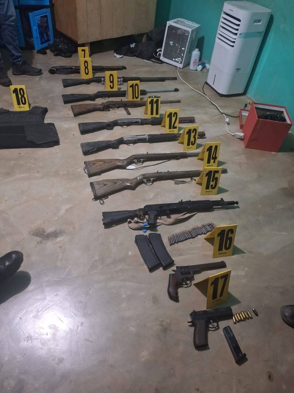 Tras el mortal atentado, agentes de la Policía Nacional Civil y personal del Ministerio Público realizaron un un allanamiento en dicho negocio, donde localizaron 11 armas de fuego de distintos calibres.