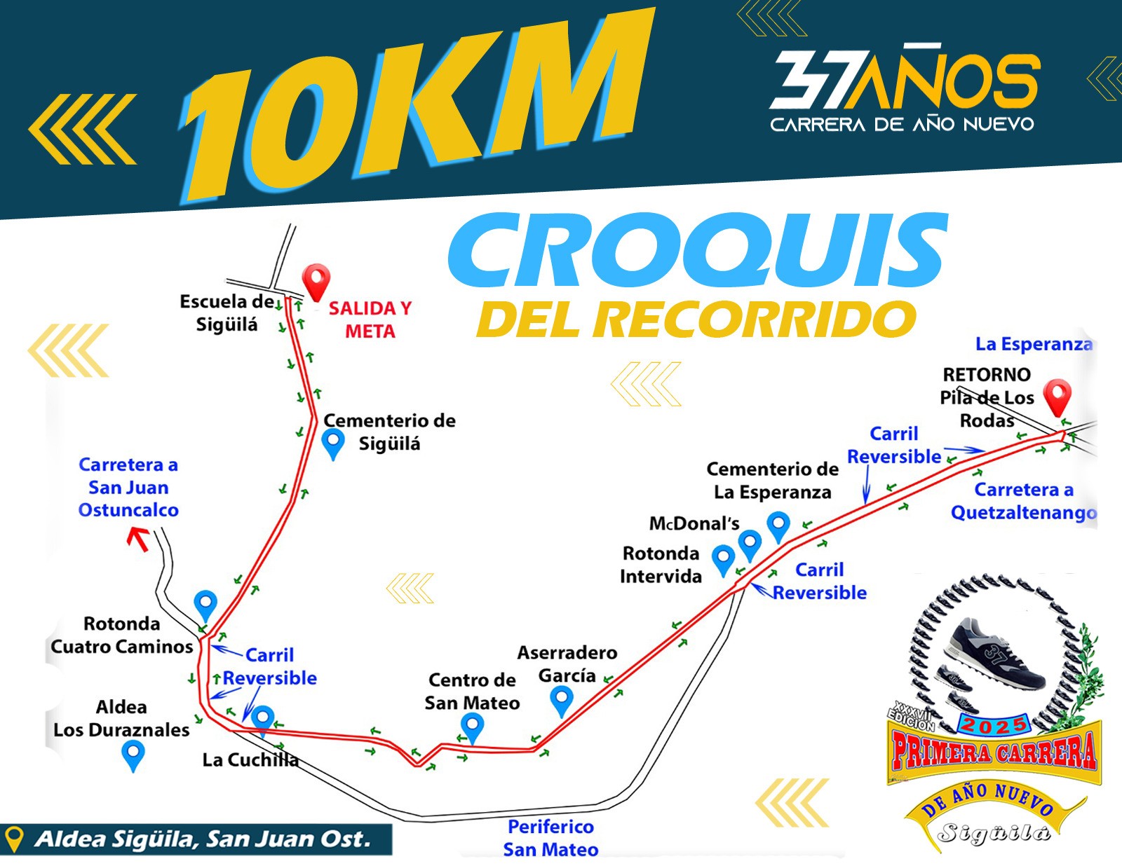 La carrera de 10 kilómetros comenzará en el centro de la aldea Sigüila, con rumbo a la carretera Nacional, en el sector conocido como Cuatro Caminos. Luego el recorrido tomará la cuchilla de Duraznales, para ingresar al centro del municipio de San Mateo, posteriormente ingresará de nuevo a la carretera Nacional para tener el retorno en el sector Pila de Los Rodas de La Esperanza, hasta llegar de nuevo al centro de la comunidad.