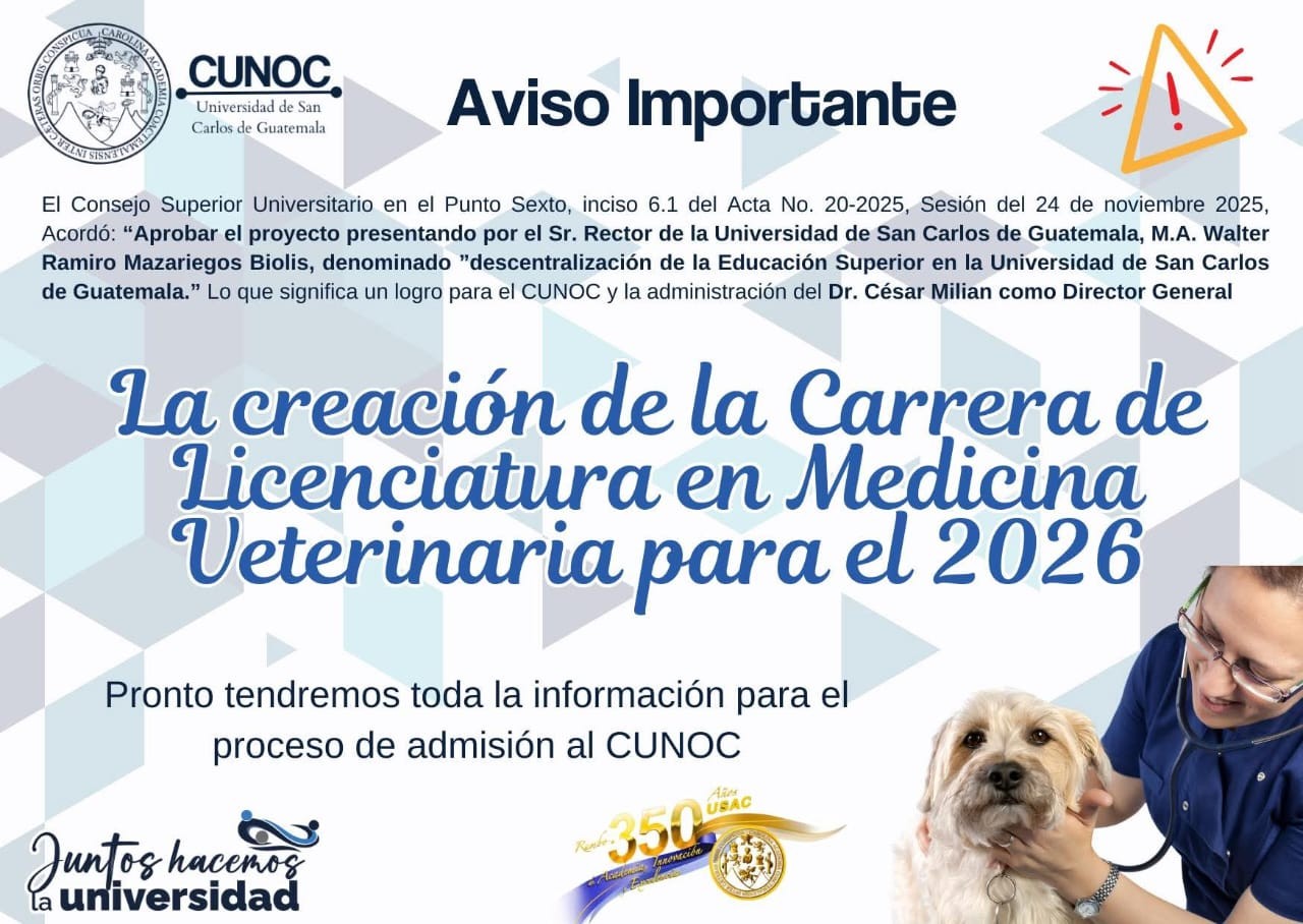 El Centro Universitario de Occidente (Cunoc) ya cuenta con la aprobación de la carrera de Medicina Veterinaria, lo cual significa un avance significativo que responde a las necesidades de estudiantes que han concluido de forma satisfactoria el nivel diversificado y que desean continuar estudiando esta carrera.