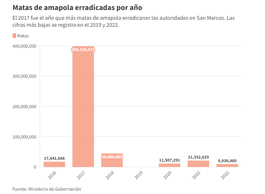 Con los datos proporcionados por información pública se halló que, de enero de 2016 a marzo de 2023, el Ministerio de Gobernación, el Ministerio de la Defensa, el Ministerio Público y la Sección de Asuntos Antinarcóticos y Aplicación de la Ley de la Embajada de Estados unidos de Norteamérica (SAA-INL) erradicaron 505,308,083 matas de amapola en San Marcos. El Gobierno de Guatemala le da un valor total de Q12,647,701,990.74 (US$1,579,508,263.00). Cada mata a Q25 (US$3['12'])['']