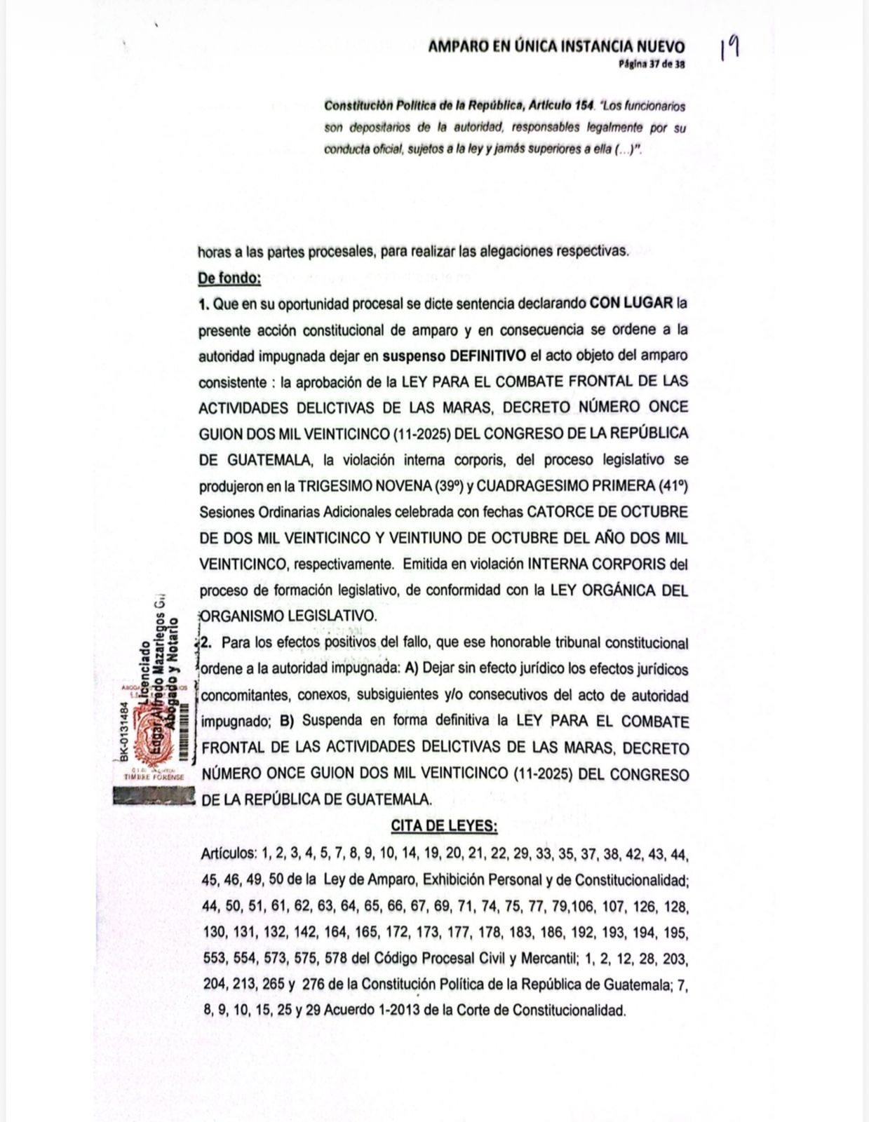 La acción es en contra del Congreso de la República y la sesión en la que se aprobó la Ley para el combate frontal de las actividades delictivas de las maras (Ley Antipandillas), señalando que se dieron irregularidades.