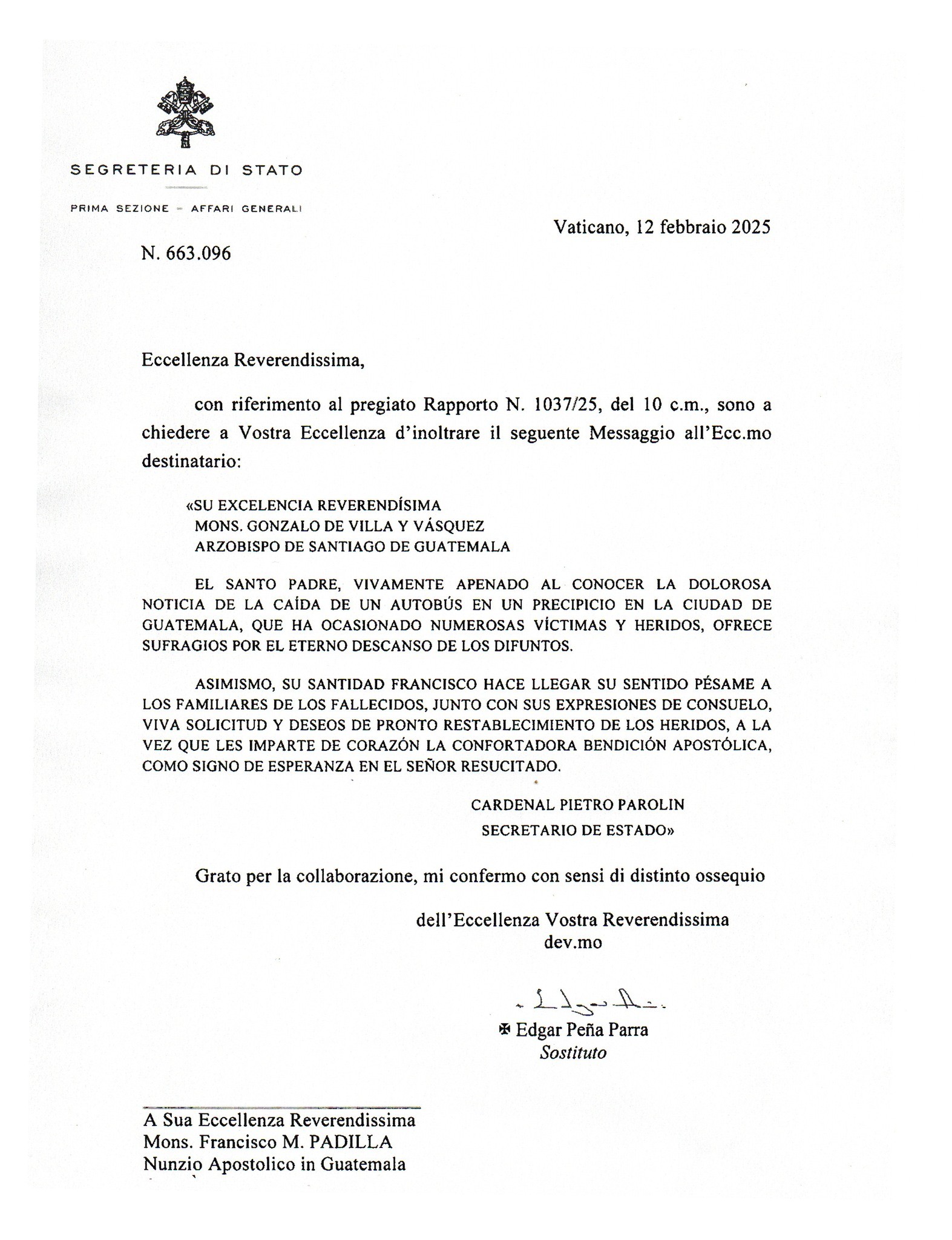 “El santo padre, vivamente apenado al conocer la dolorosa noticia de la caída de un autobús en un precipicio en la Ciudad de Guatemala, que ha ocasionado numerosas víctimas mortales y heridos, ofrece sufragios por el eterno descanso de los difuntos”, indica el mensaje del papa.