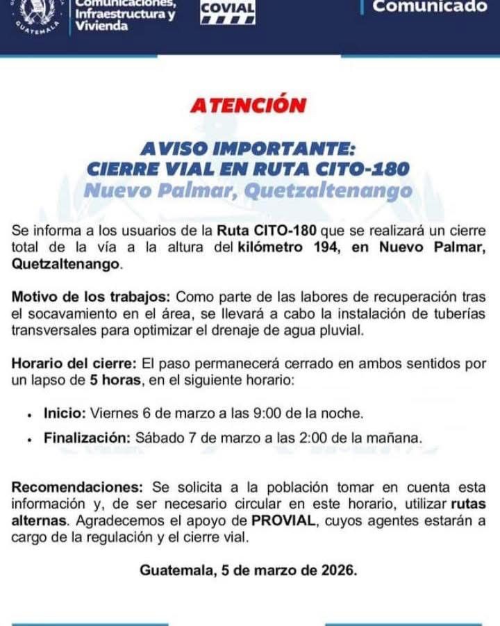 El Ministerio de Comunicaciones, Infraestructura y Vivienda (CIV) informó que en la ruta Cito-180 se realizará un cierre total en el kilómetro 194, jurisdicción del Nuevo Palmar, Quetzaltenango.