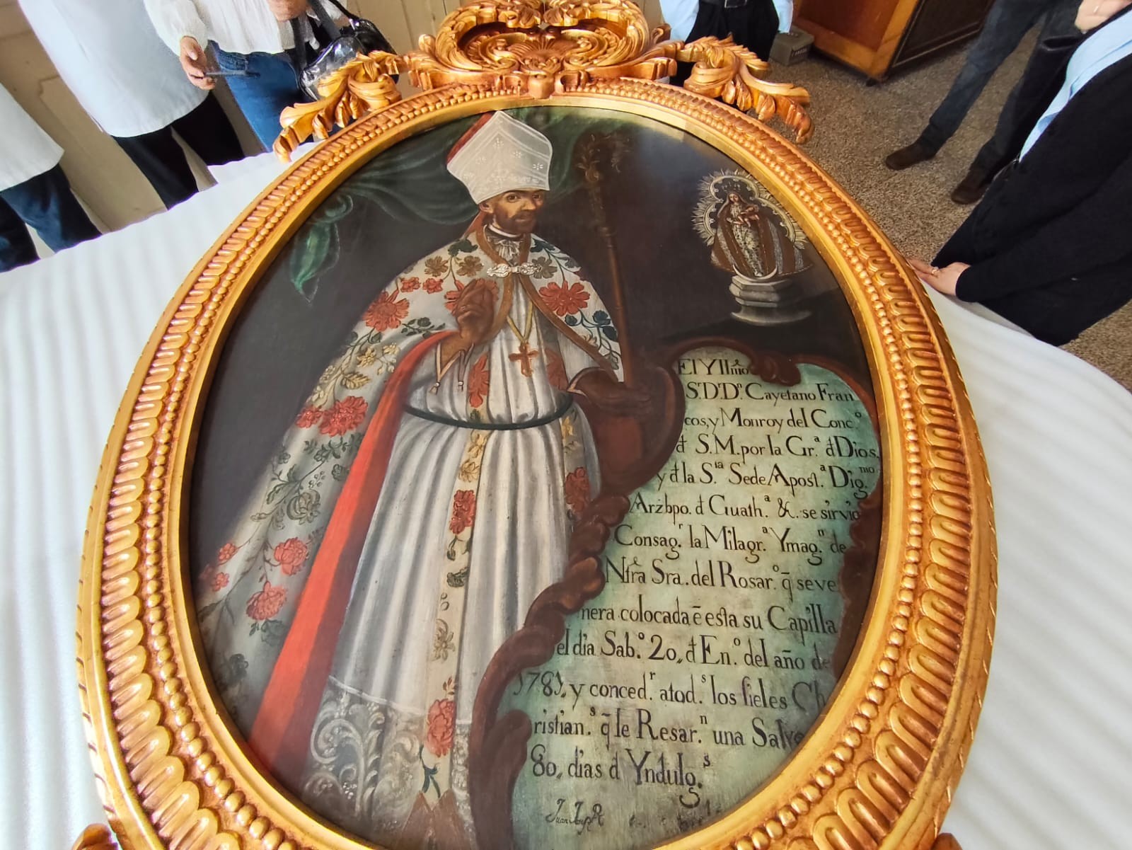La pieza, atribuida al reconocido pintor guatemalteco Juan José Rosales, retrata el momento histórico de la consagración de la Virgen el 20 de enero de 1781 por parte del Arzobispo de Guatemala Fray Cayetano Francos y Monroy, según se detalla en la cartela que acompaña la obra. Su calidad artística y su carga simbólica la convierten en un testimonio significativo de la devoción y la historia altense.