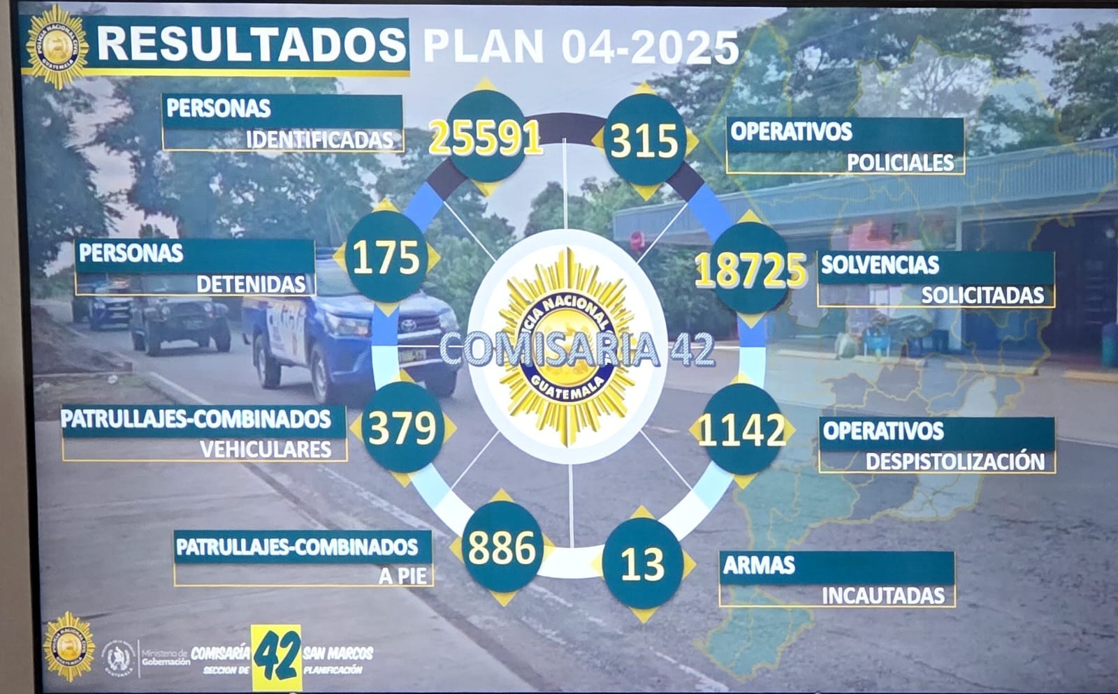 En cuanto a los homicidios, el departamento registra 53 casos en lo que va del año, cifra menor en comparación con el año anterior. Sin embargo, algunos meses han mostrado incrementos, principalmente en los municipios de La Blanca, Ayutla, Malacatán y Ocós, donde se han concentrado más hechos delictivos. Las autoridades señalaron que los operativos continuarán en la región.
