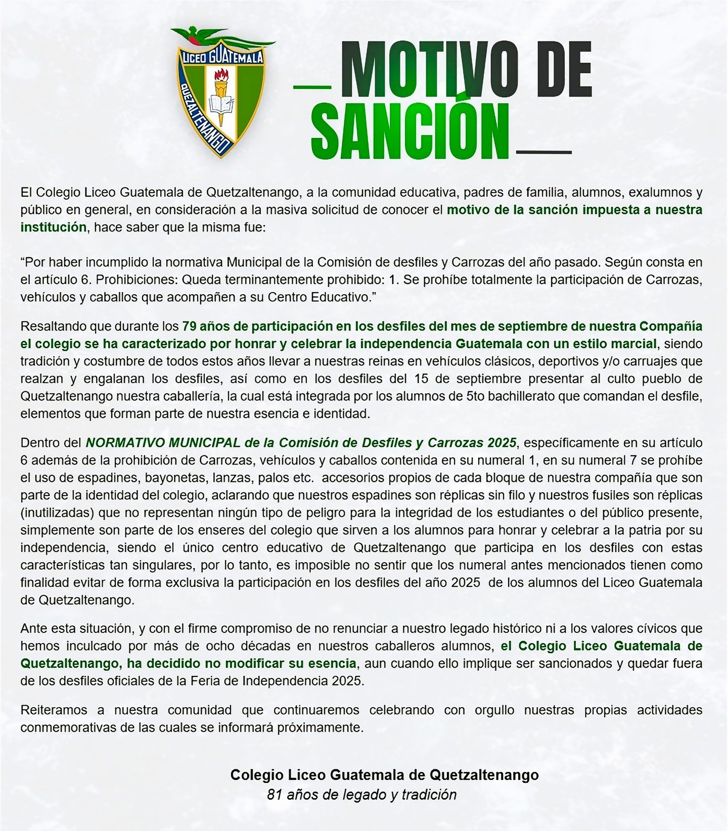 La dirección del Colegio Liceo Guatemala informó que no participarán en los desfiles programados para Xelafer 2025, y en un comunicado señaló que el motivo se debe al incumplimiento de la normativa municipal de la Comisión de Desfiles del año pasado, en la que se prohibía la participación de carrozas, vehículos o caballos.