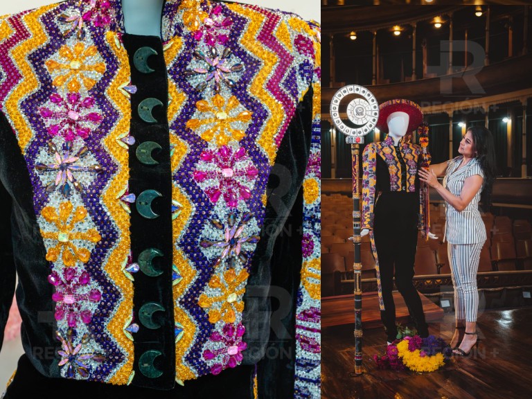 Gerra detalló que la chaqueta tipo torero, elaborada en terciopelo negro, simboliza la elegancia y fortaleza de la mujer de Xelajú. Está bordada con símbolos mayas auténticos y elementos del traje ceremonial, adornada con cristales que reflejan la luz “como si fueran estrellas”. Los botones son siete lunas talladas en jade, un tributo a la luna de Xelajú y a las siete copas del Xelajú MC, símbolos de orgullo y pasión quetzalteca.