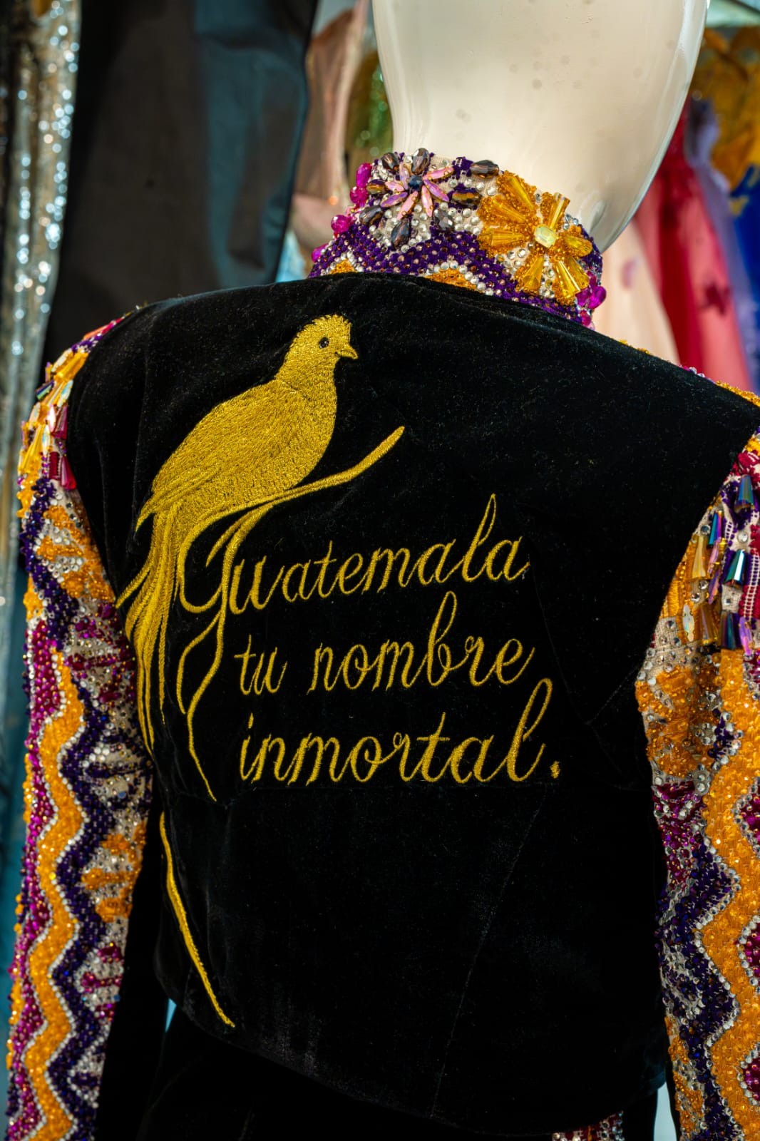 En la parte posterior del traje, un quetzal bordado en hilo dorado despliega su vuelo sobre la estrofa “Guatemala, tu nombre inmortal”. Este detalle, explicó Gerra, unifica todo el concepto en un mensaje claro: somos una nación que brilla con dignidad, poder y herencia eterna.