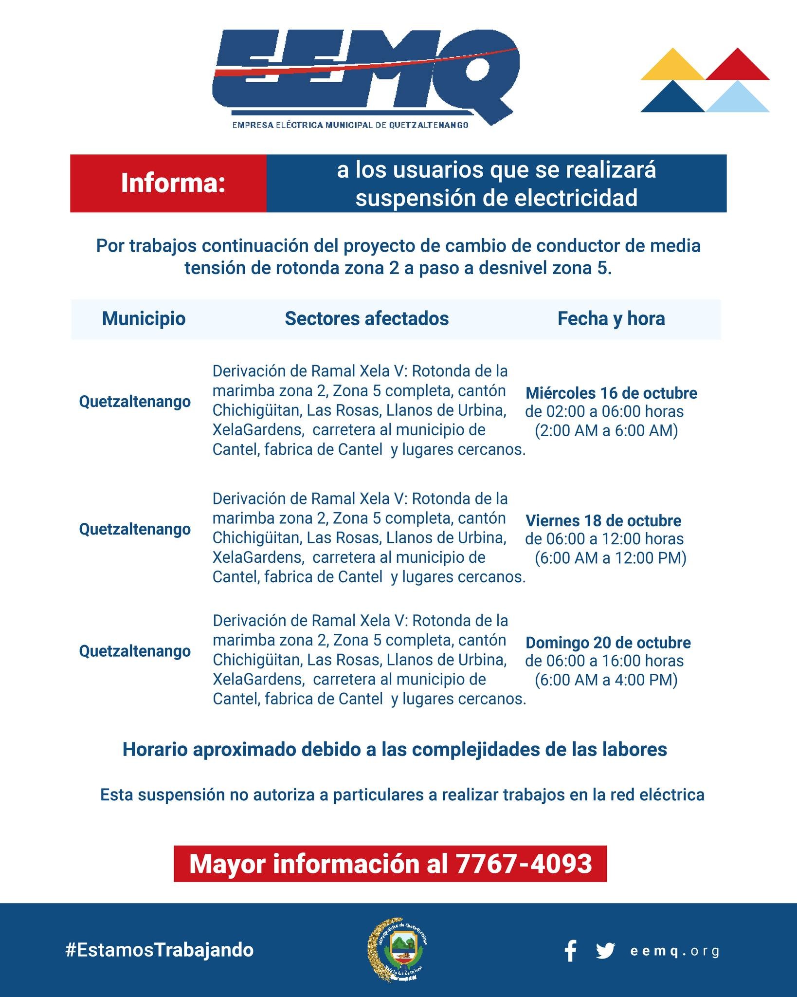 La Empresa Eléctrica Municipal de Quetzaltenango (EEMQ) ha informado sobre la suspensión programada del servicio de energía eléctrica en varios sectores del municipio, debido a los trabajos de continuidad del proyecto de cambio de conductor de media tensión, que se realizarán entre la rotonda de la marimba, en la zona 2, y el paso a desnivel en la zona 5.