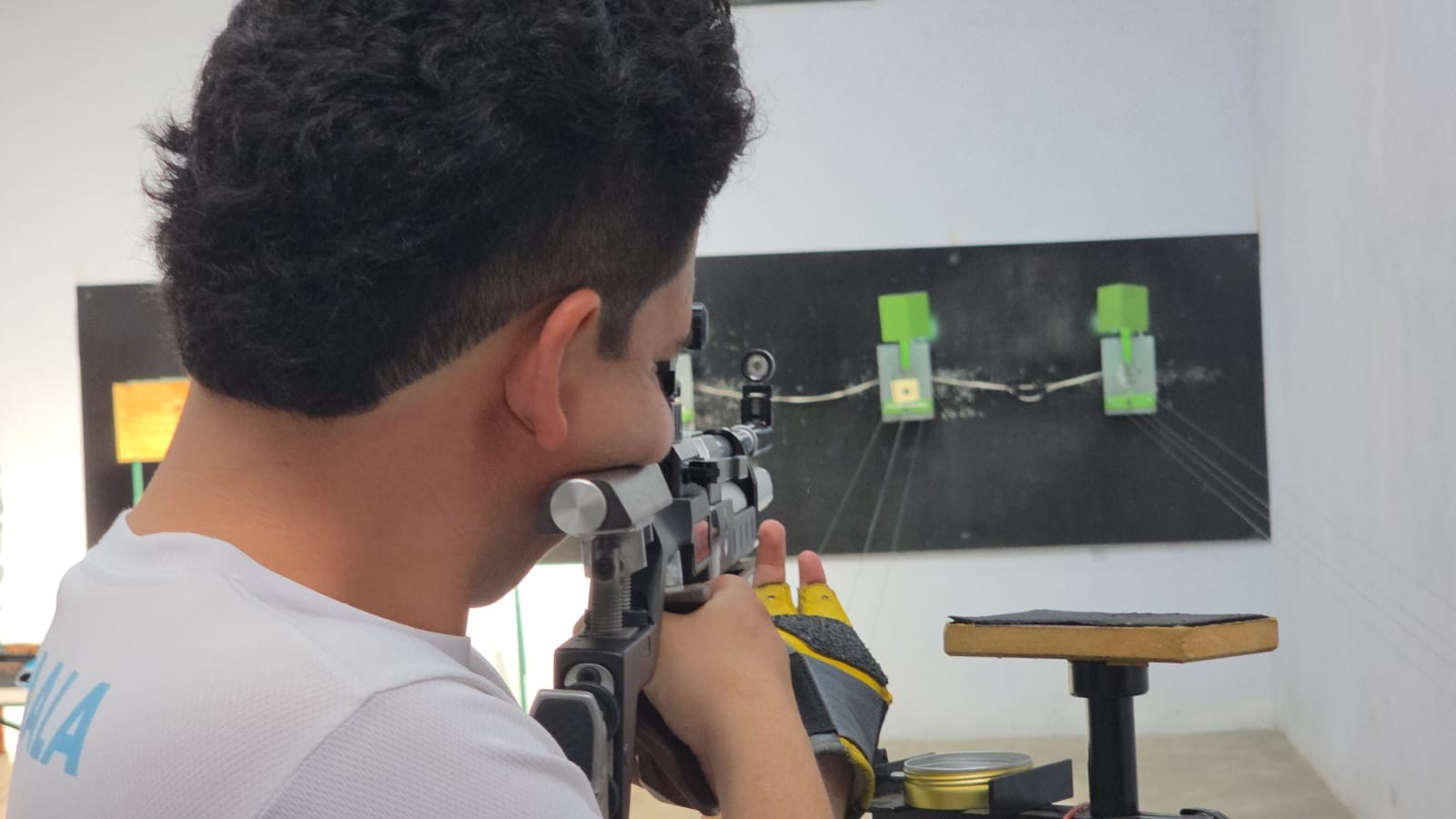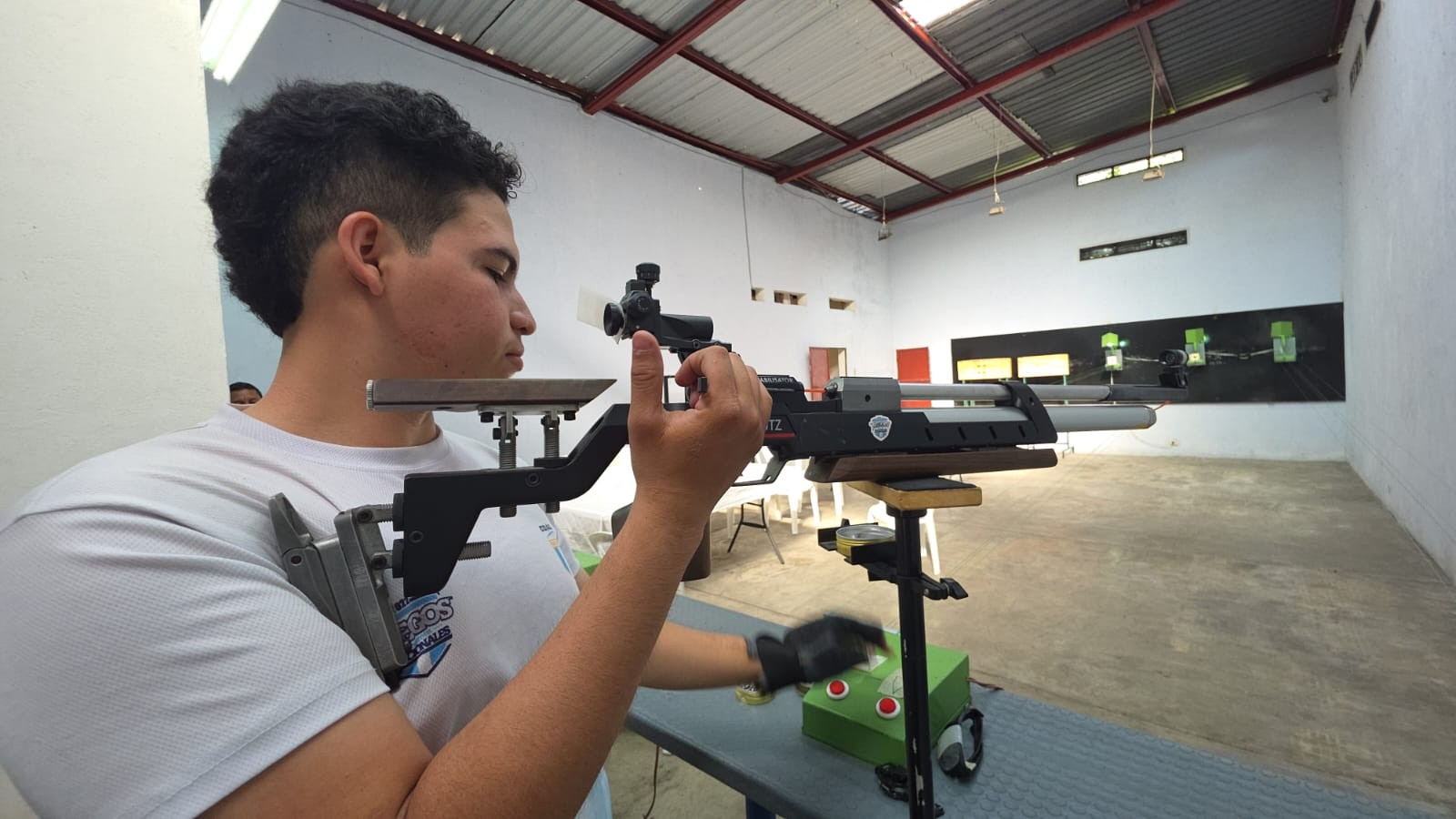 Denilsson de León, quien pasó de ser atleta a entrenador durante los 9 años que lleva el deporte en Mazatenango, explica que el polígono cuenta con tecnología de punta para la práctica a 10 metros de distancia.