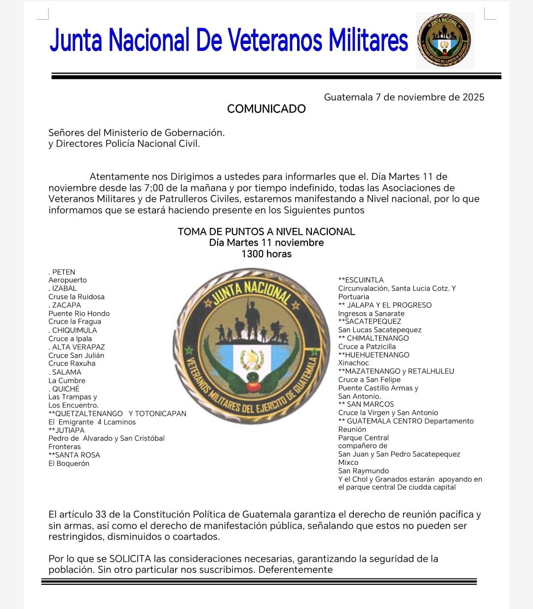 La Gobernación Departamental de Guatemala confirmó que este martes 11 de noviembre se llevarán a cabo manifestaciones a nivel nacional organizadas por veteranos militares y expatrulleros, quienes exigen al Congreso de la República que se incluya en agenda la Ley 64-16 para su primera lectura.