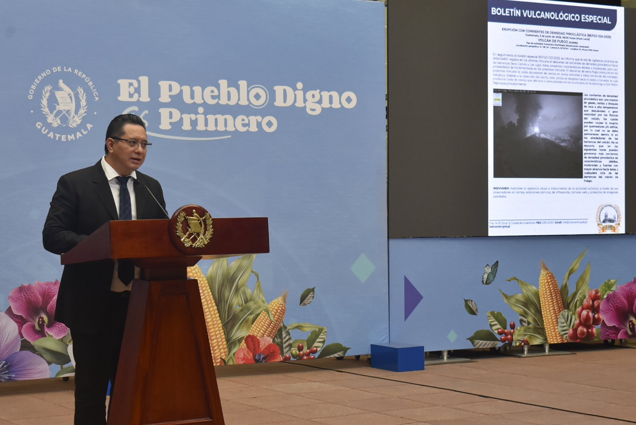 El director del INSIVUMEH, Ing. Edwin Rojas, brindó detalles sobre la evolución de la erupción, señalando el descenso de corrientes de densidad piroclástica hacia las barrancas Seca, Ceniza y Las Lajas.