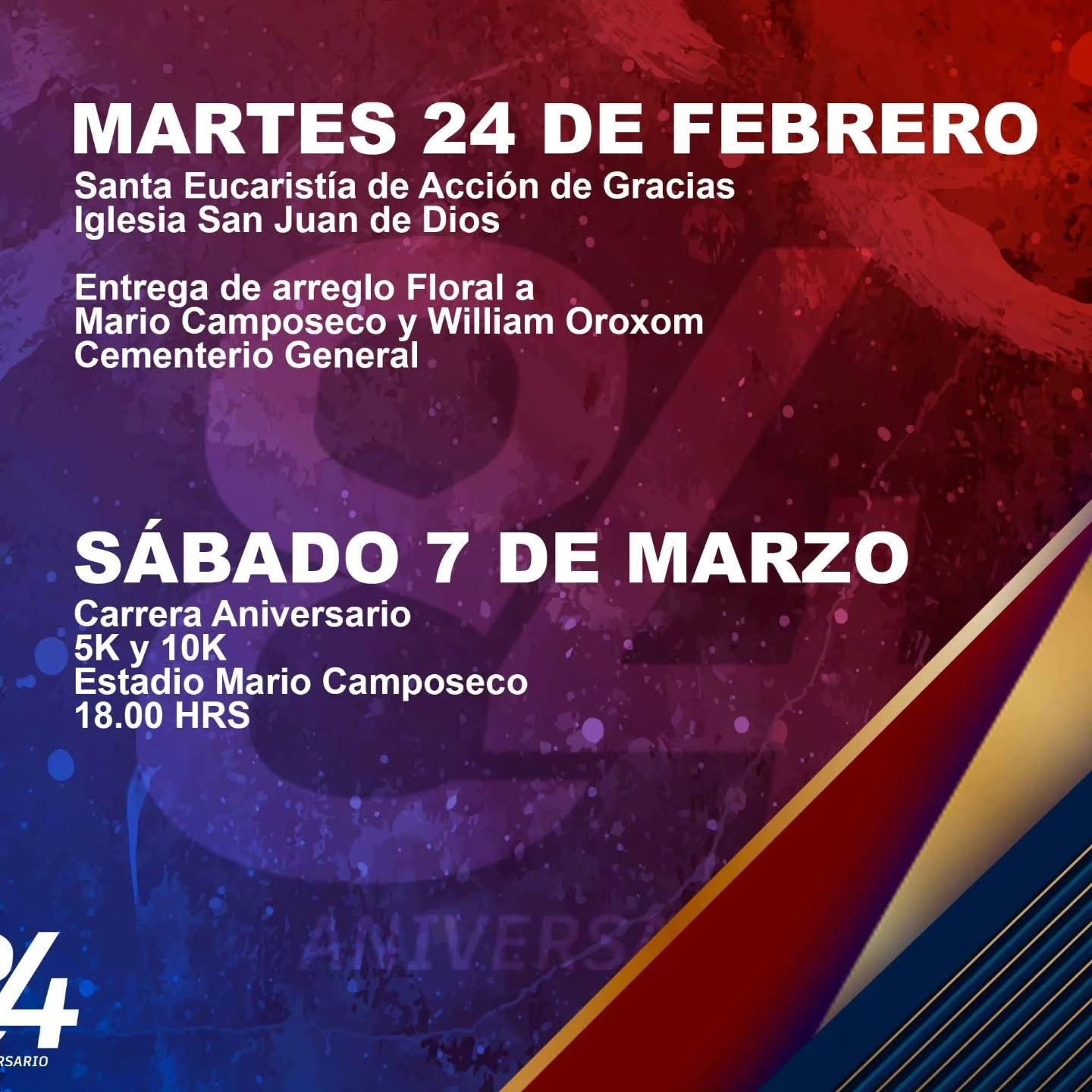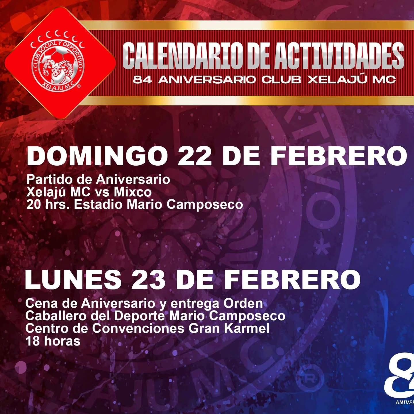 Las actividades comenzarán el domingo 22 de febrero con la celebración del partido de aniversario frente a Deportivo Mixco, por la jornada 8 del torneo Clausura 2026, el juego será a las 20 horas en el estadio Mario Camposeco .